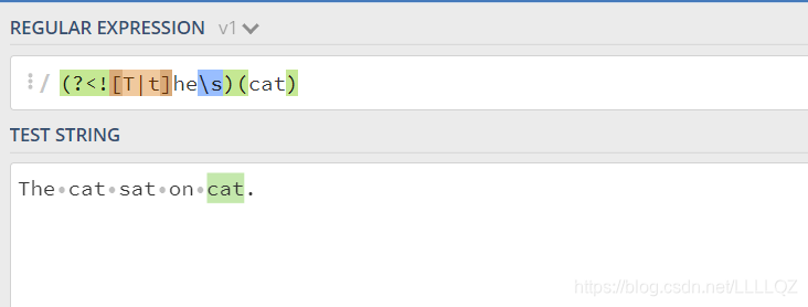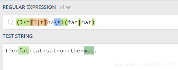 筛选所有匹配结果,筛选条件为 其前跟随着断言中定义的格式。 例如,表达式 (?<=(T|t)he\s)(fat|mat) 匹配 fat 和 mat,且其前跟着 The 或 the。