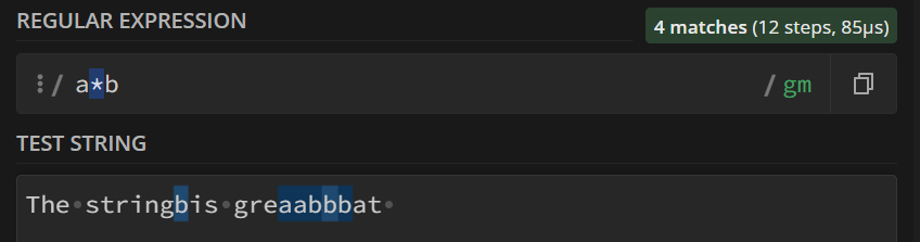 PS:“0次”:如果单个a*那肯定是 \(1 \to \infty\) 个a; 后面跟一个别的比如说 a*b 就是 \(0 \to \infty\) 个a开头的接下来是b的字符串