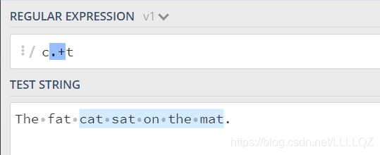 +号匹配+号之前的字符出现 >=1 次。 例如表达式c.+t 匹配以首字母c开头以t结尾,中间跟着至少一个字符的字符串。