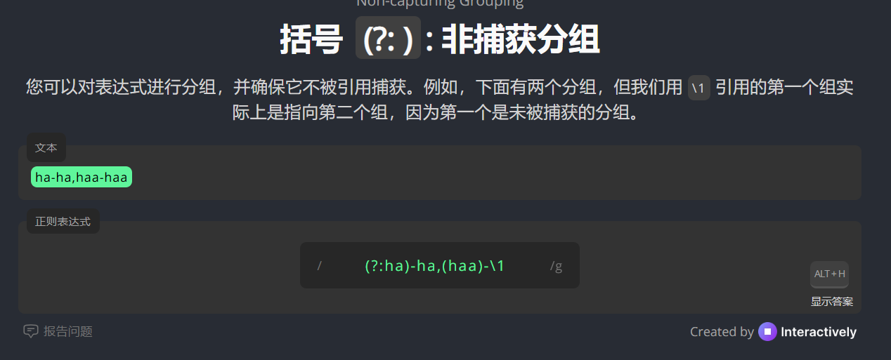 特征标群是一组写在 (…) 中的子模式。(…) 中包含的内容将会被看成一个整体,和数学中小括号( )的作用相同。例如, 表达式 (ab) 匹配连续出现 0 或更多个 ab。如果没有使用 (…) ,那么表达式 ab 将匹配连续出现 0 或更多个 b 。再比如之前说的 {} 是用来表示前面一个字符出现指定次数。但如果在 {} 前加上特征标群 (…) 则表示整个标群内的字符重复 N 次。