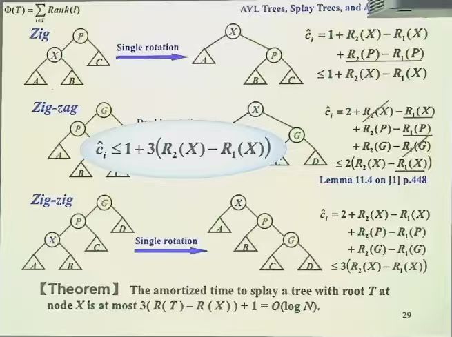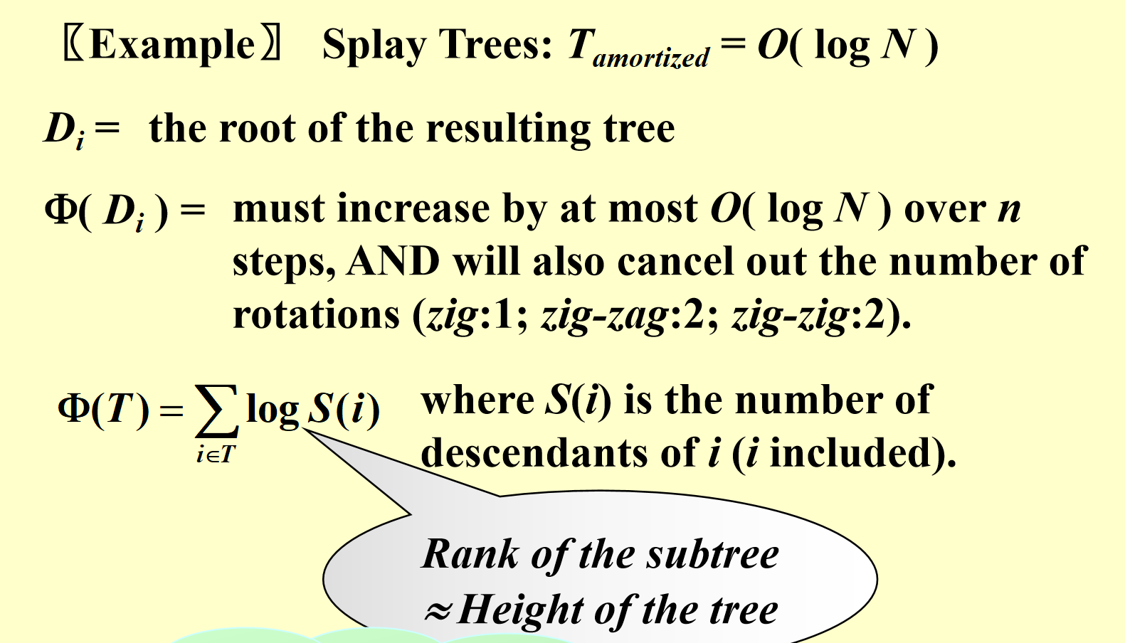 首先要选取势能函数:每次旋转操作后,发生变化的只有 X / P / G 的子树的节点数,其他node的子树的节点数不变;另外,由局部性原理:rank 只与局部有关(X / P / G),使得 rank 的计算简单于 树高 height。