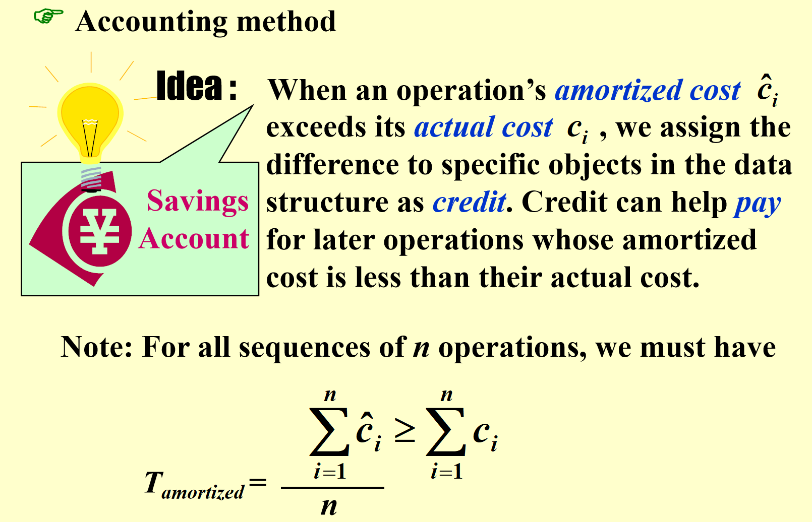 思想:\(n\) 个操作花时间为 \(T(n)\),In the worse case, amortised cose is \(T(n) / n\)