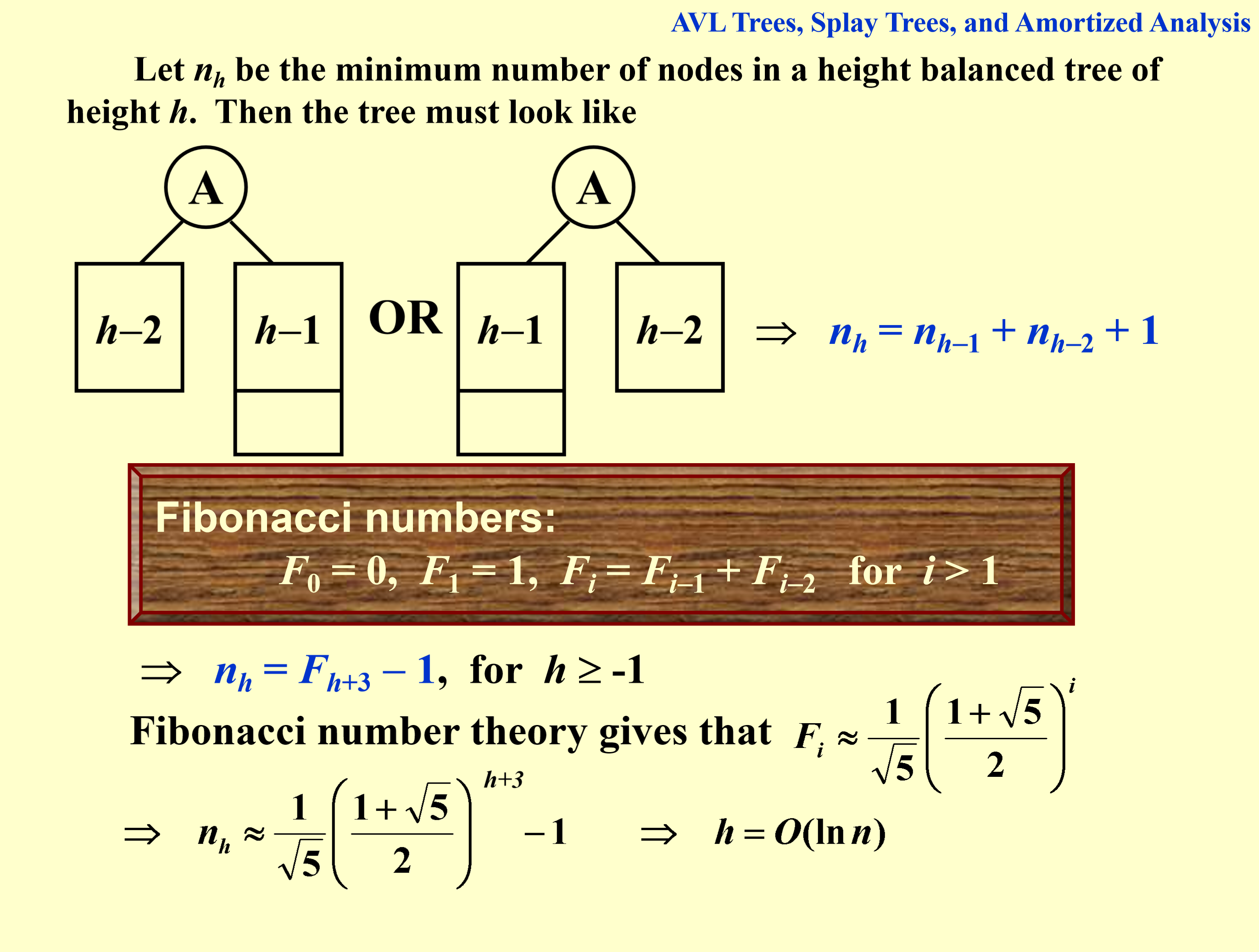\(n_h\) 为高度为 h 的 AVL 树的最小节点数,由于是最小,则 root 的左右子树高度差1(相等的话左 / 右减去一个还是 AVL 树)