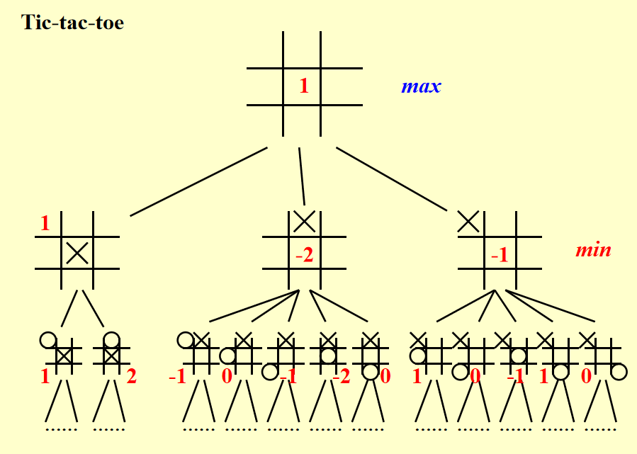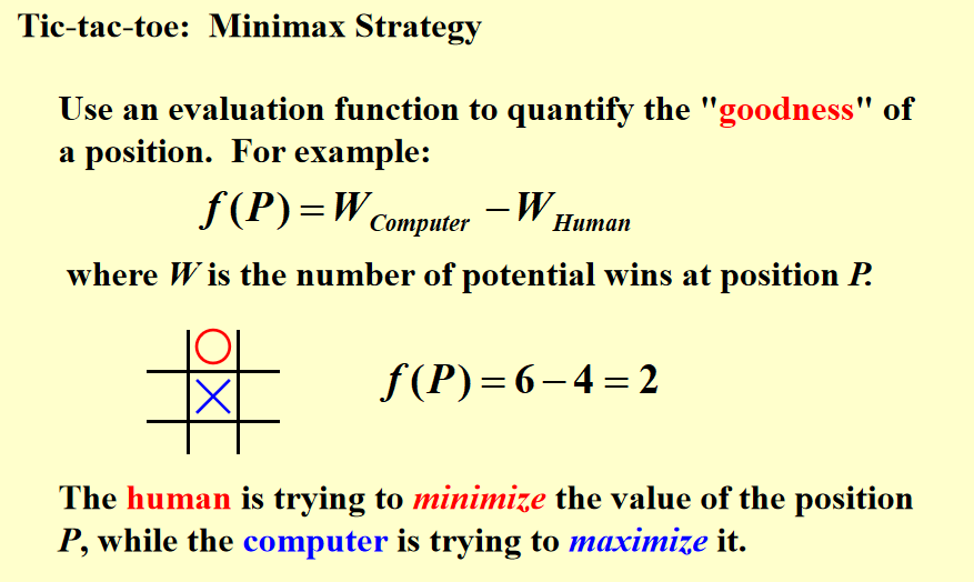 事实上估价函数可以很复杂,例如alpha go 就是在这训练了一个神经网络。这里我们取在当前情况下,只让一方(A)走另一方(B)不走,A走赢的可能性的数量 - B 走赢的可能性的数量 = 分数,这里 A 是计算机,B是人,那么分数越高对计算机越有利