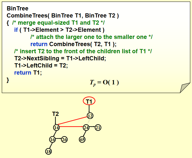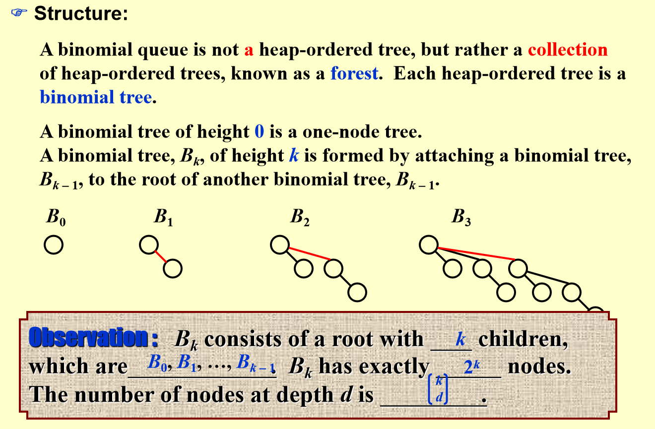 对于高度为 k 的二项树的结构唯一:由两棵高度为 k - 1 的二项树合并而成。合并方法:直接合并,将一个的 root 连到另一个的 root 上面