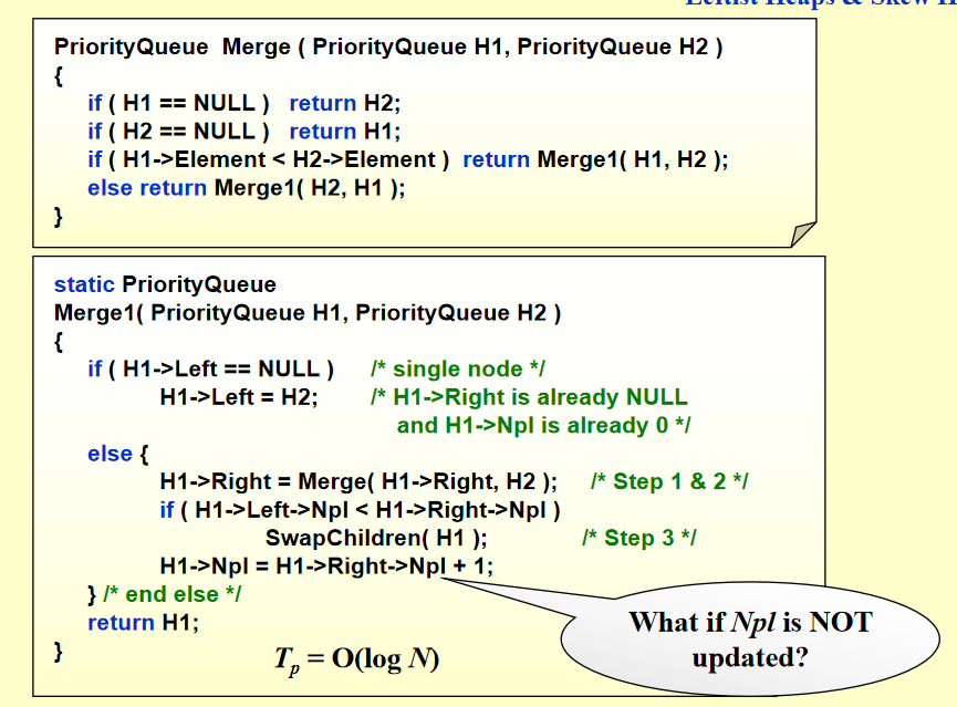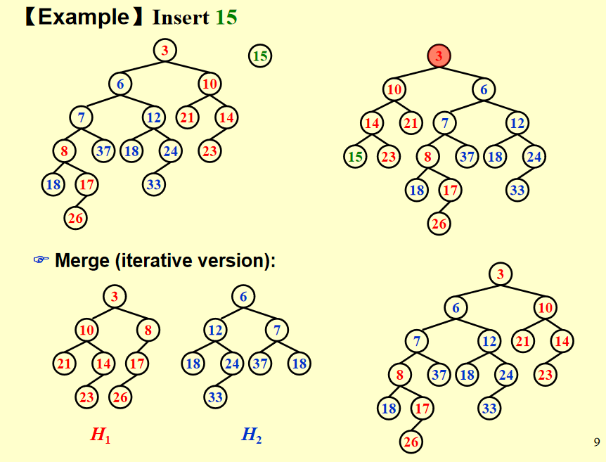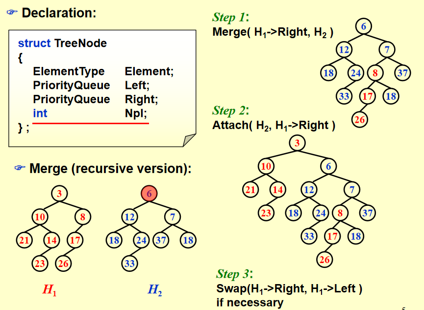 算法代码理解:先比较哪个堆的根节点小(记为 H1),H1 的根作为合并之后堆的根,H2 往 H1 的右子树插,也就变成了 H2 与 H1 的右子树合并(这时原来 H1 的右子树的根就变成了新的根),这就是一次递归,再进行比较,等等等。终止条件就是,有一个堆为 NULL,则直接返回另一个堆,下一步操作就是将另一个堆接在那个 NULL 的地方