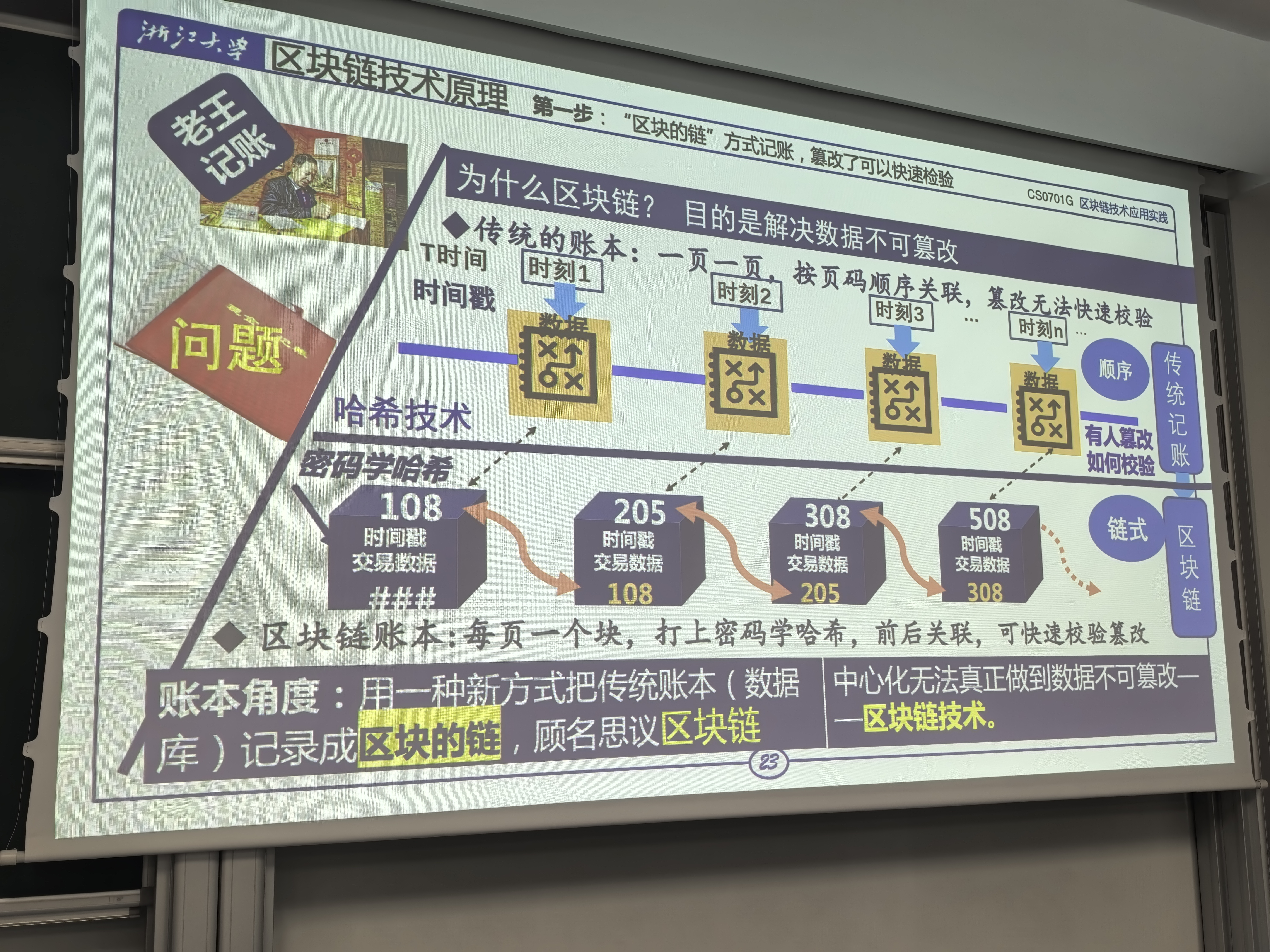 实际上:按时间,每一时刻(交易之后),以时间点为单位,成为block,对应账本的“页”,在一个block之后,通过一种算法,即哈希函数(密码学内容),算出一个返回值,一个“码”记在一个 block 上,每产生一个block,都哈希一次,将上一次block的内容与下一次的连起来(两个block连起来),即区块的链