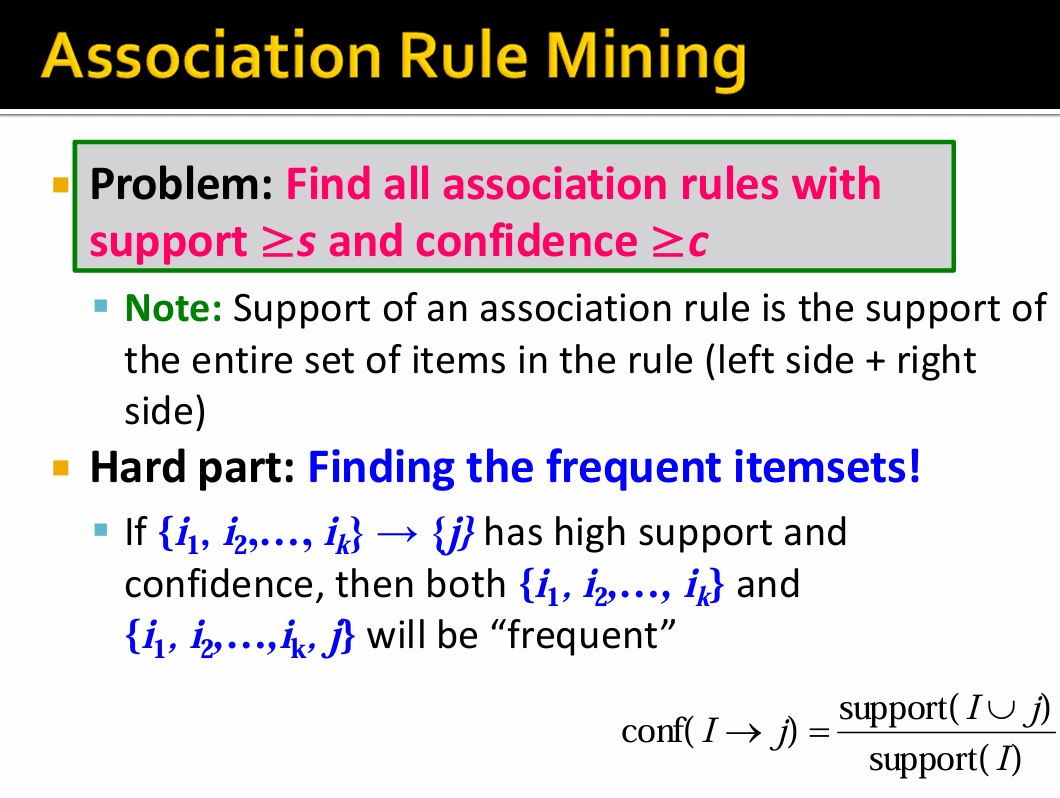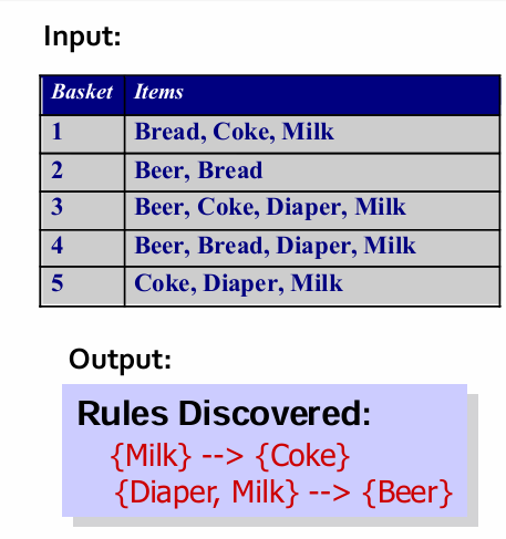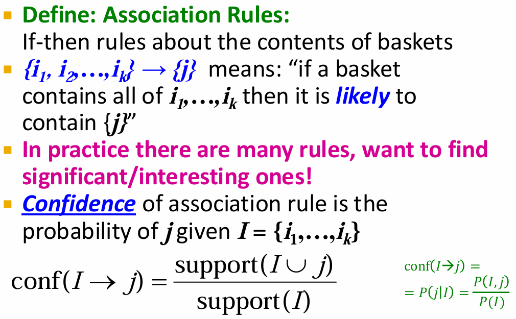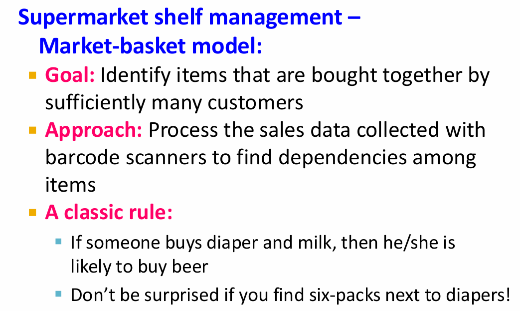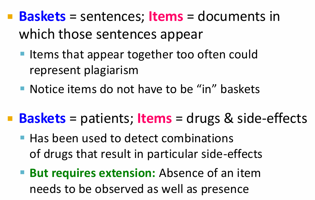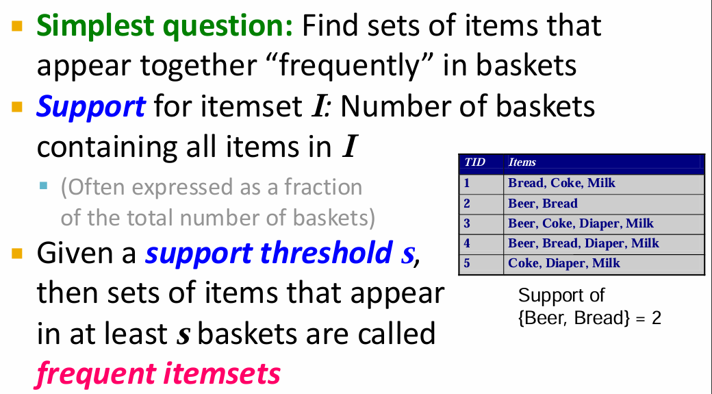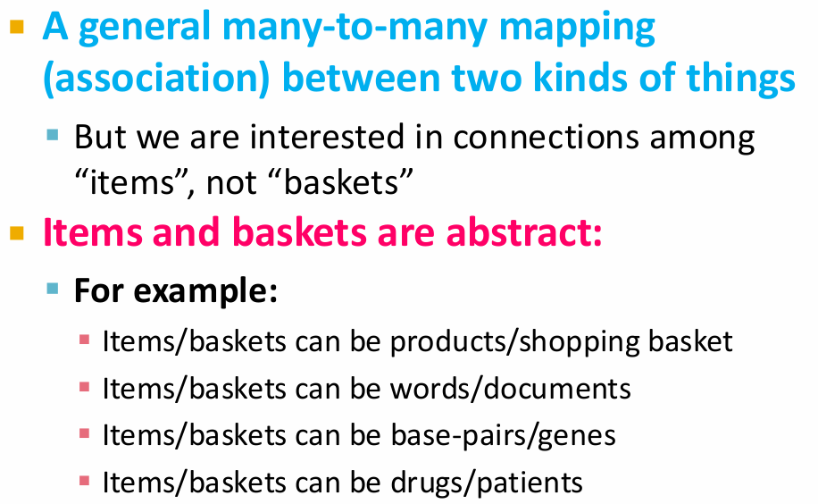 - A large set of baskets (e.g., things a customer buys on one day), each basket is a subset of items, 每个basket都是由一些item组成