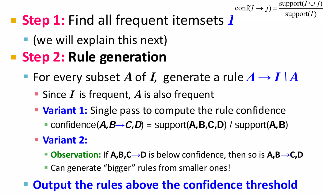 For each frequent itemset I, for each non-empty subset A of I, output the rule \(A \rightarrow I | A\) ( \(I | A\) 就是 \(C_I A\) ) if it meets the minimum confidence threshold. 这里其实就是反过来的逻辑,前面是一个集合并另外一个,现在是找到并起来的集合,然后拆分成两个部分。