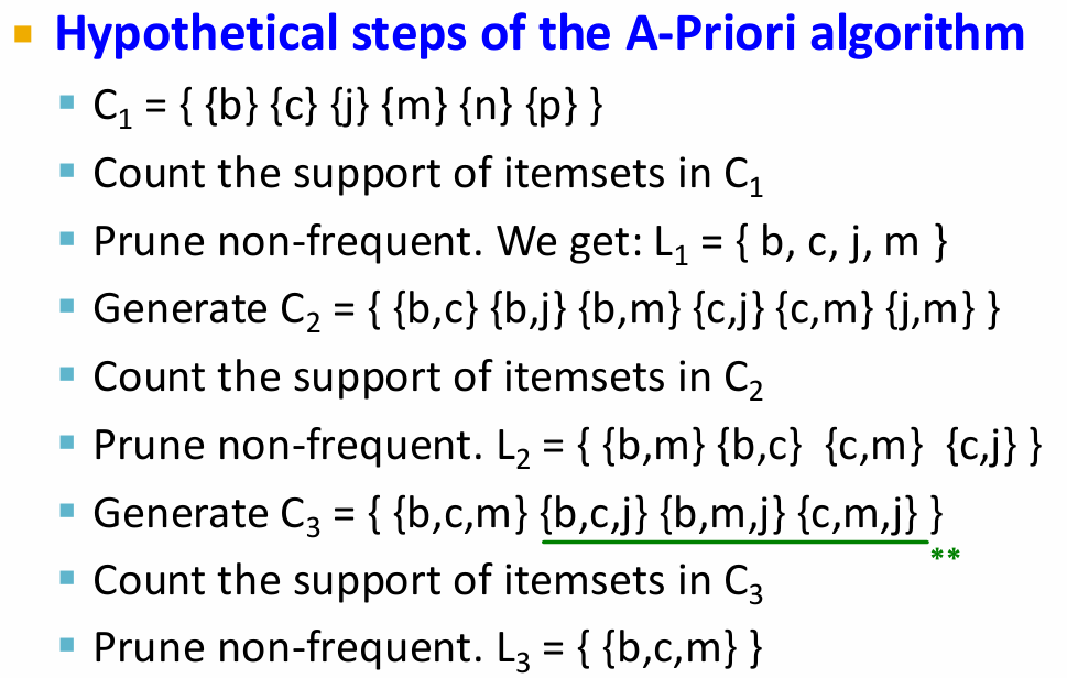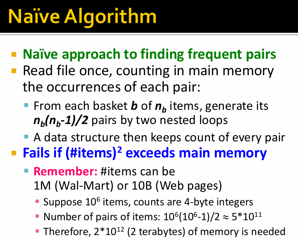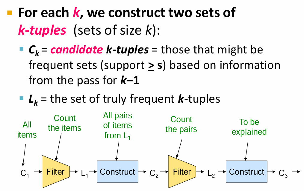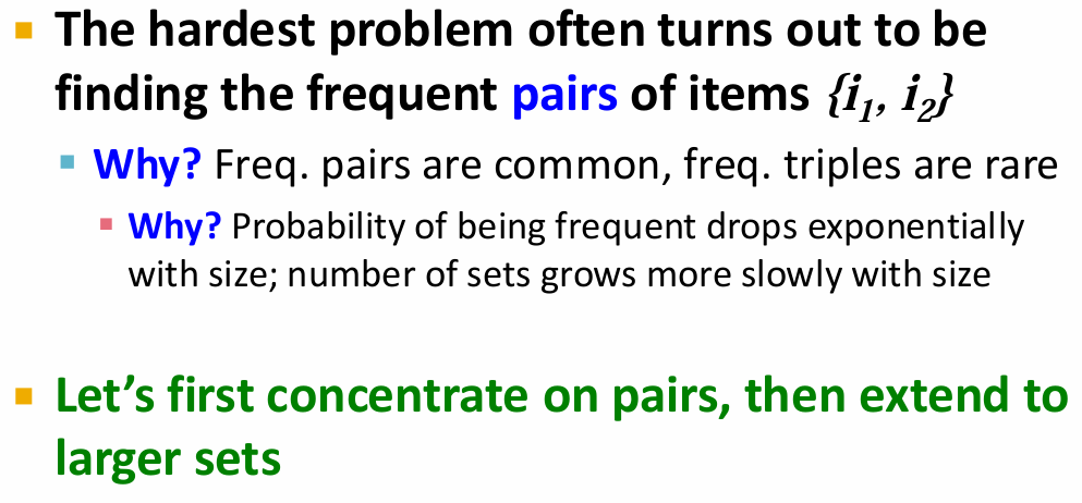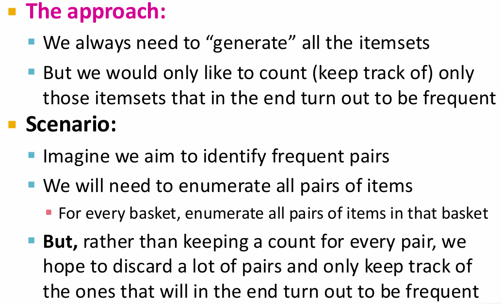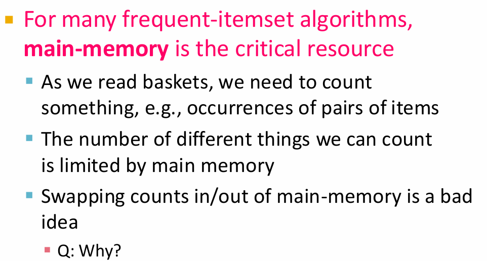 main-memory 大小是主要限制因素,所以目的是:只扫描 things at the end will be as judged as frequent itemsets. 即只扫描 likely to be frequent 的 itemsets, and if it is not likely to be frequent, we do not want to scan it.
