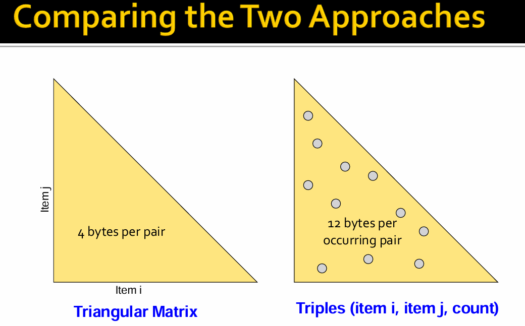 实现方案: - preallocate a 2D array of size n*n, where n is the number of items: 首先预分配空间 - for each transaction, increment the count for each pair in the transaction:在每个格子里写数量