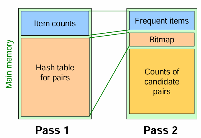 - Second Pass: 只考虑那些 hash 到 frequent buckets 的 pairs 作为 candidate itemset。
