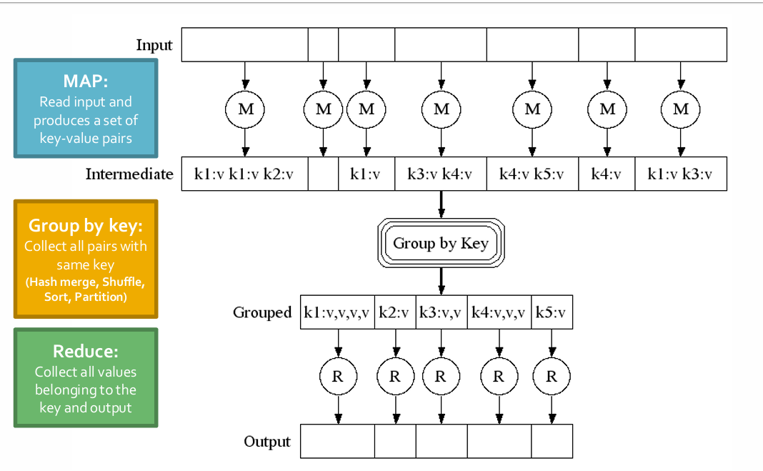 Groupe by key Phase: 根据上一步骤得出的键值对将数据按键进行分组,结果是每个键对应好多值,然后有好多键。这一步是系统自动执行的。