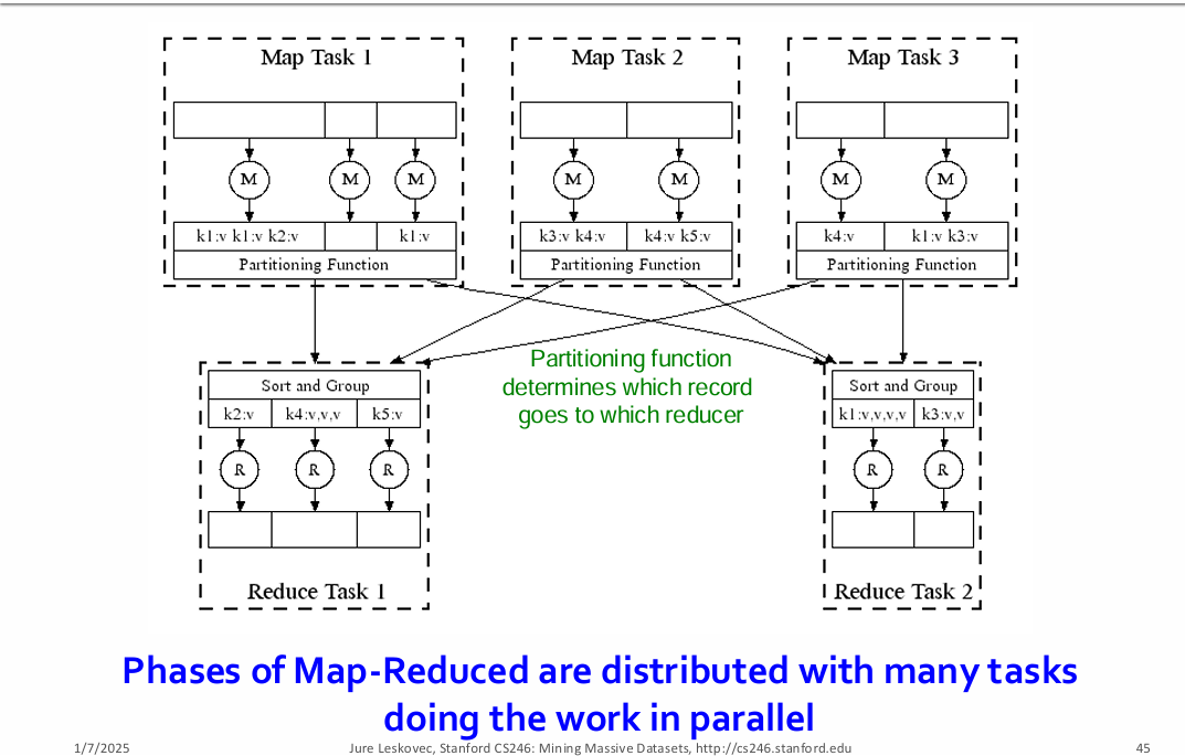 Reduce Phase: 对每个键及其对应的值进行归约操作(提取有效信息),生成最终的输出结果。需要 programmer 编写Reduce函数来定义归约逻辑。