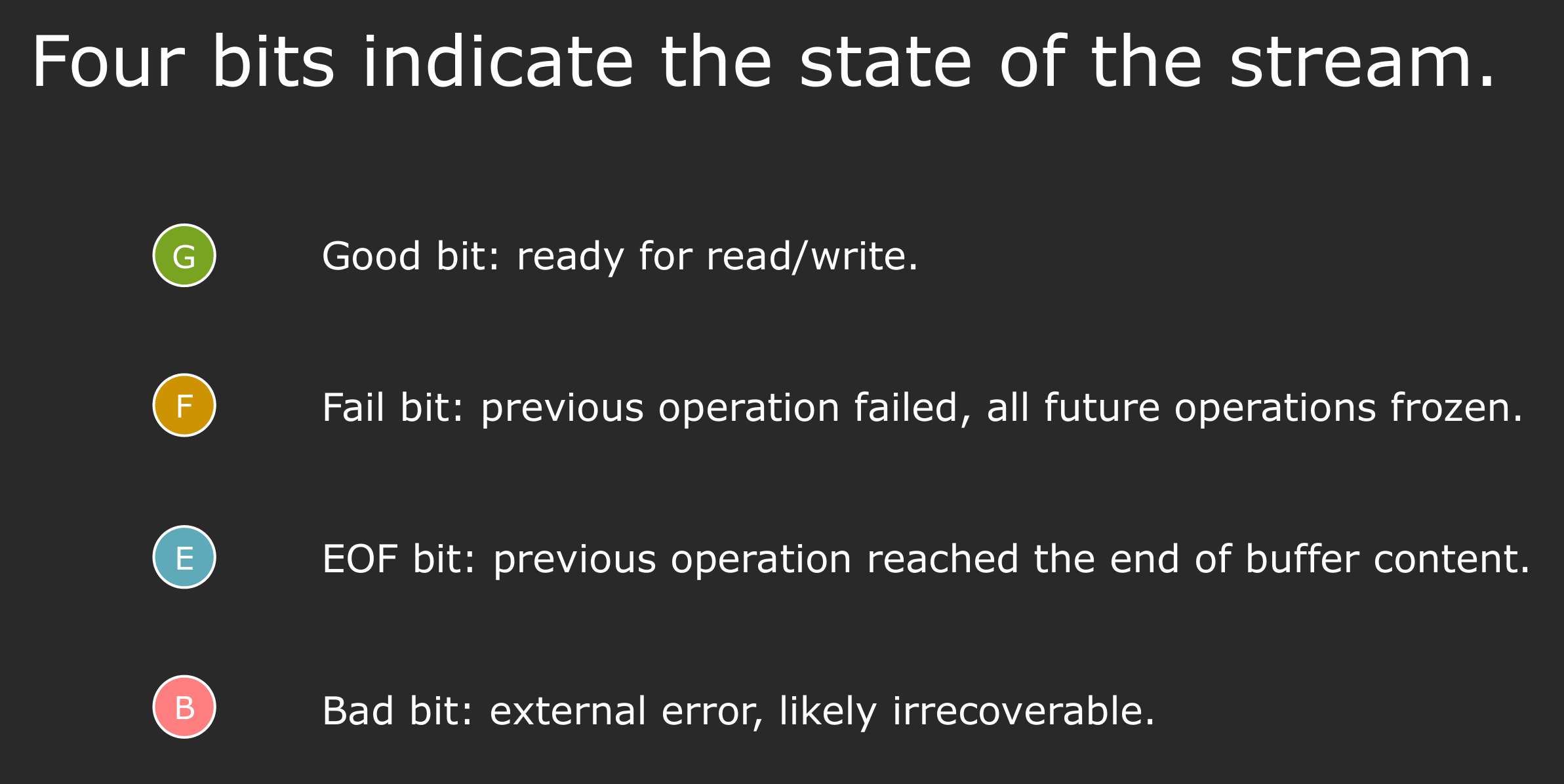 一个流对象(cin, cout, ifstream 等)都有四个重要的状态标志(state bits):