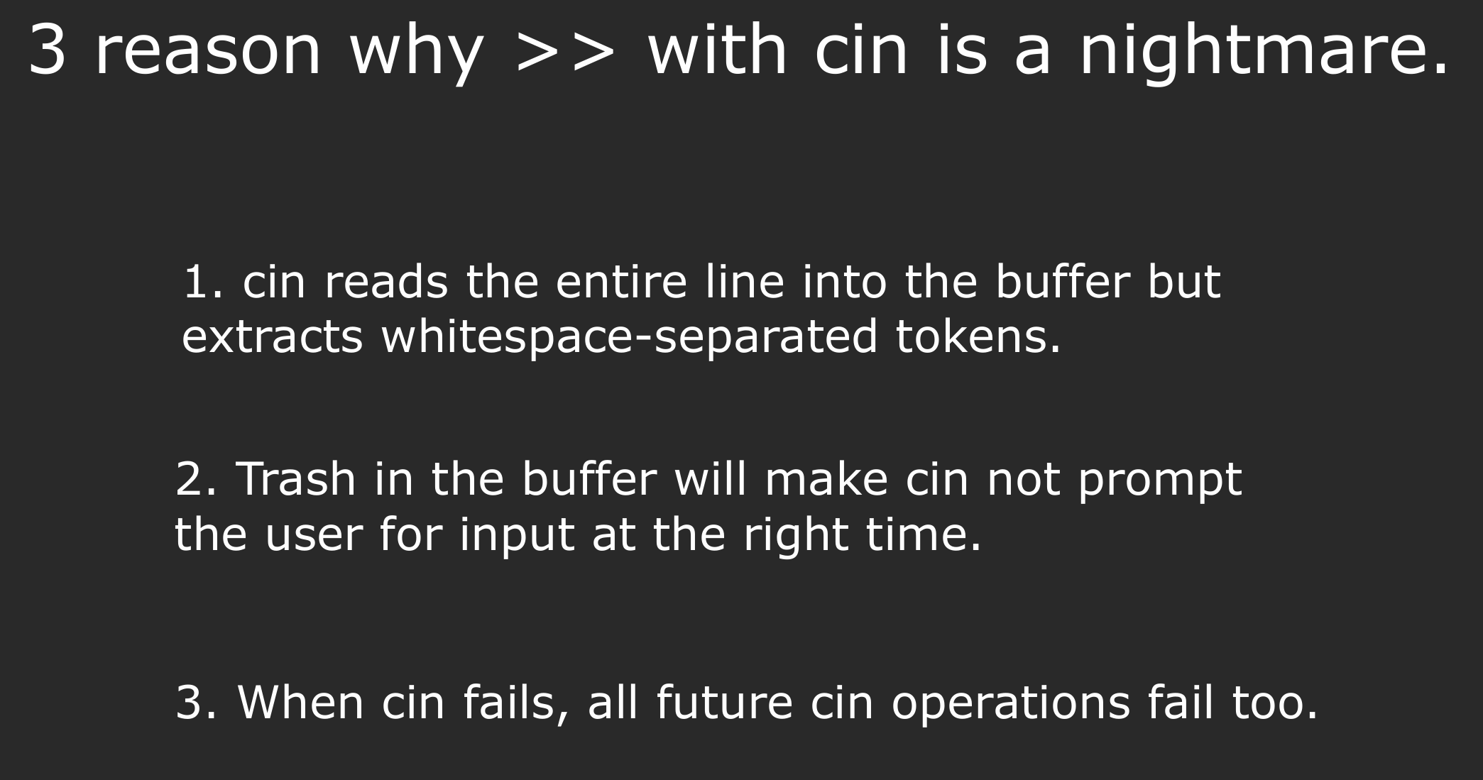 "abc\n"。 cin尝试提取整数 → 发现第一个字符'a'不是数字。- 读取失败: