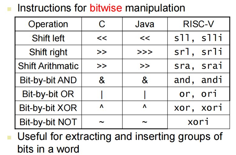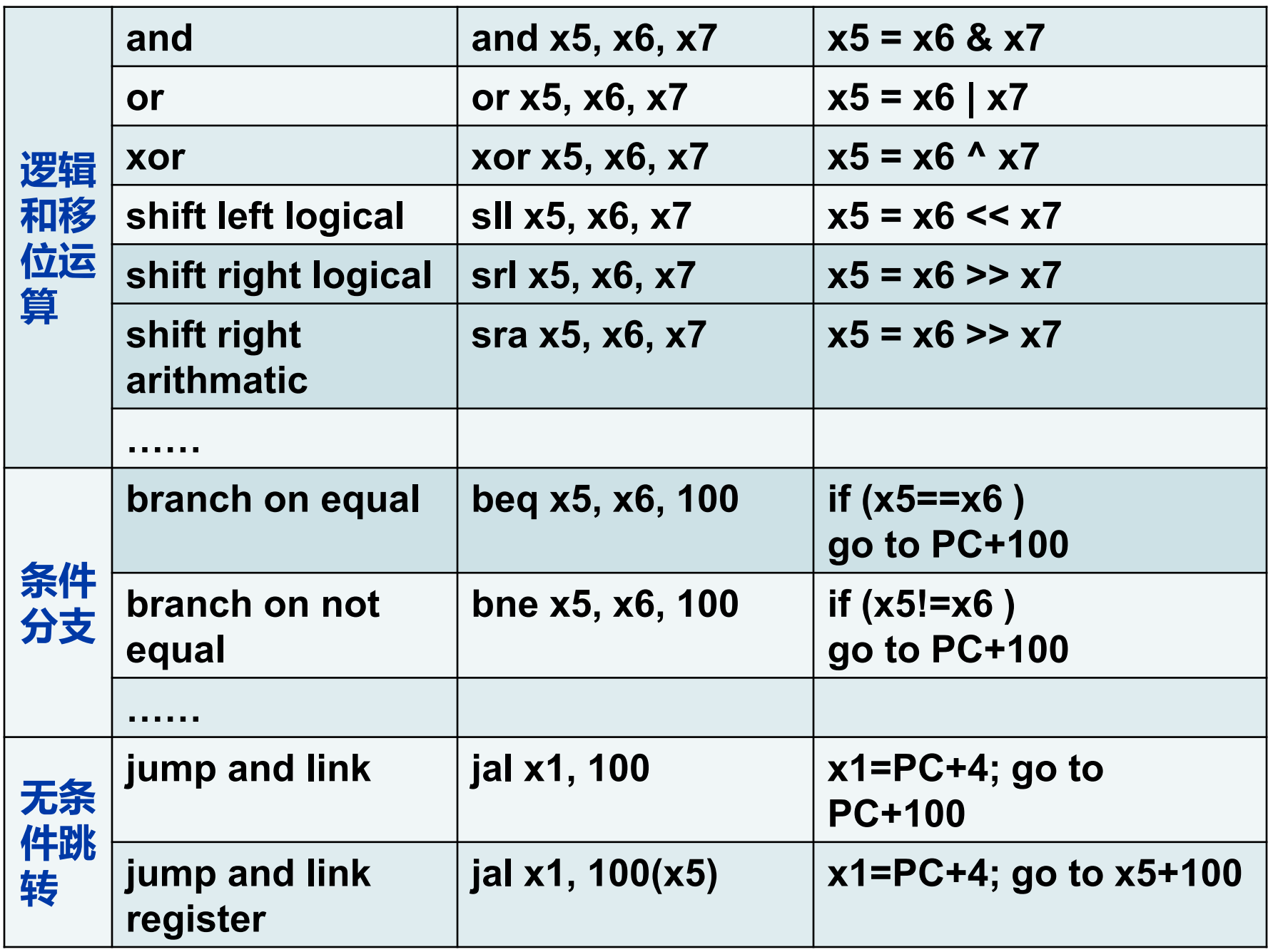 | R-type | funct7 | rs2 | rs1 | funct3 | rd | opcode | 寄存器对寄存器运算 | 3个寄存器 + 2个功能码 | |||||||