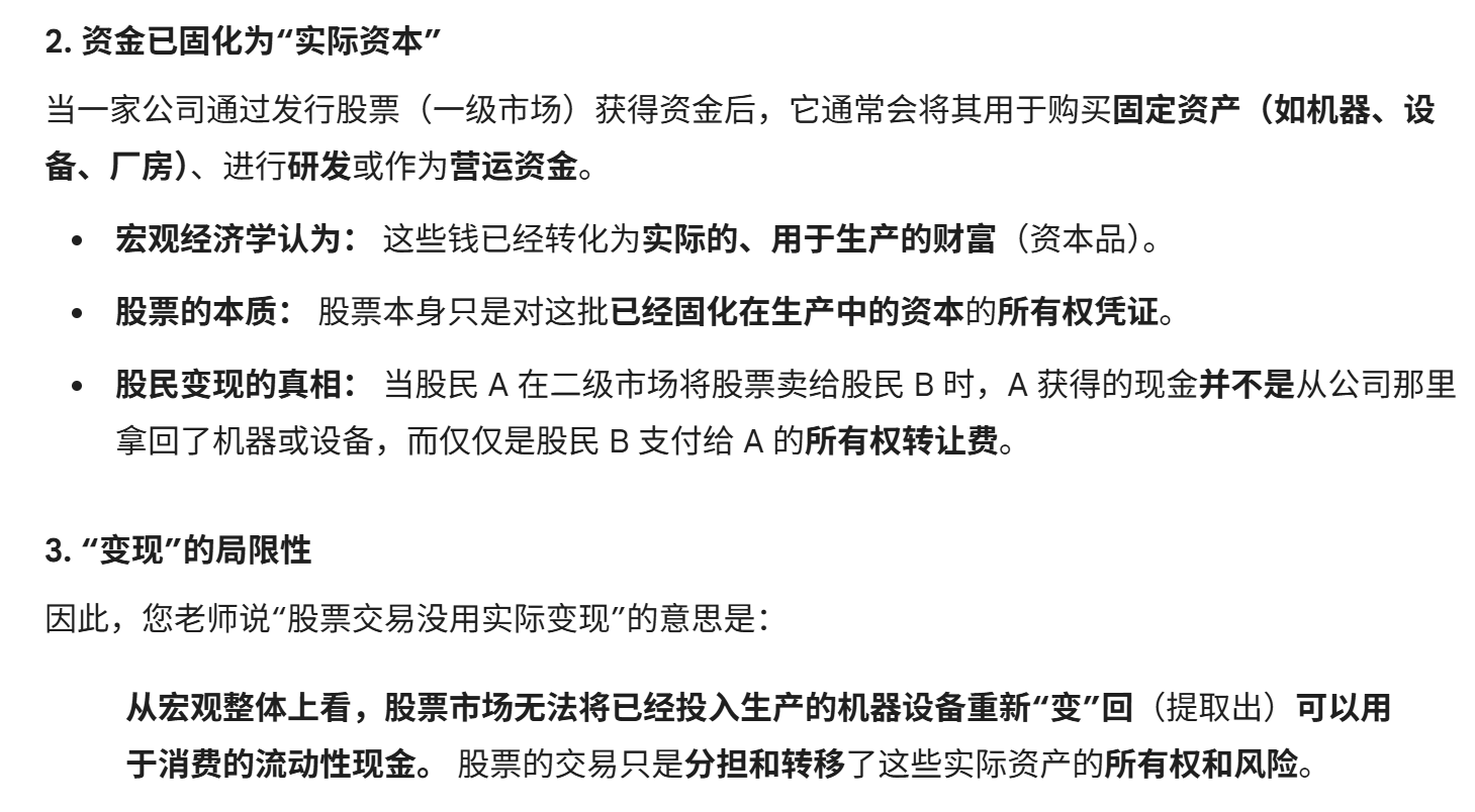 股票:从微观的角度考虑,股民交易股票确实变现,但从宏观的角度考虑,股票交易没用实际变现,那部分钱早就变成公司的机器设备等在生产。企业破产才能变现。