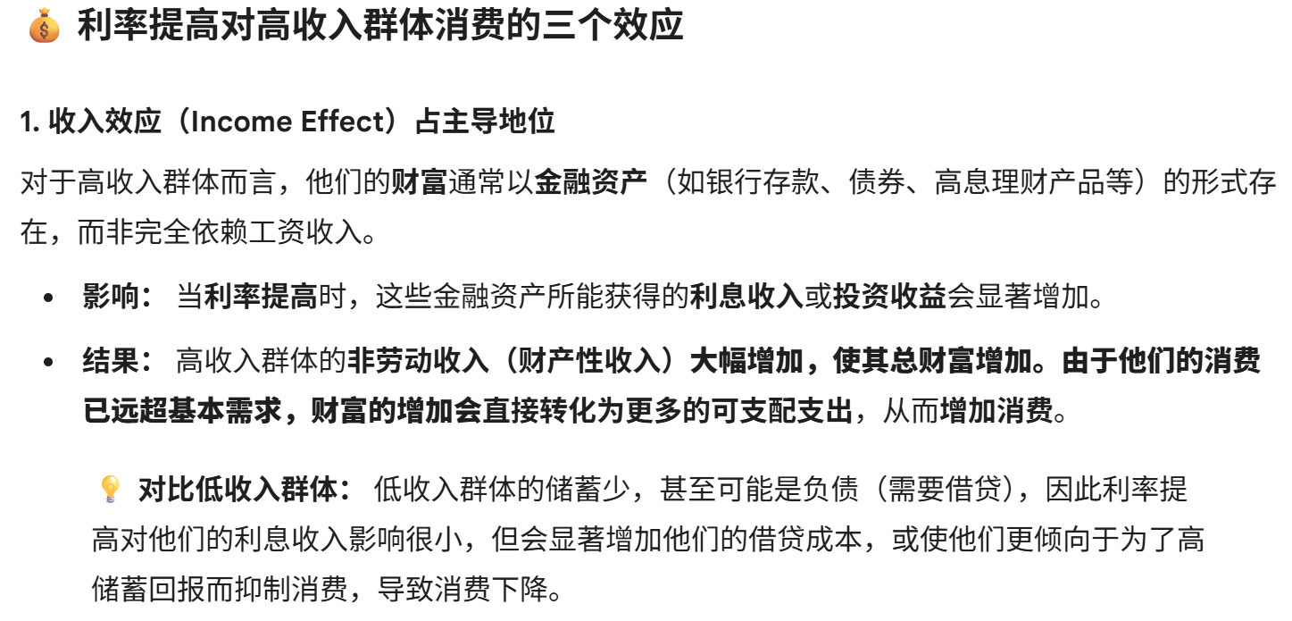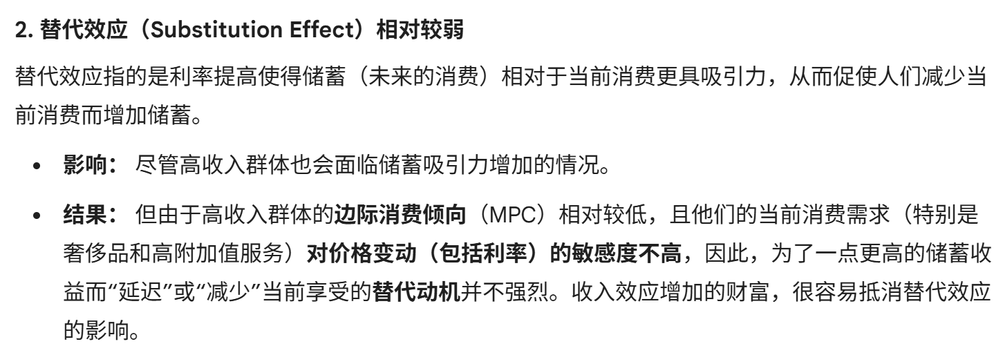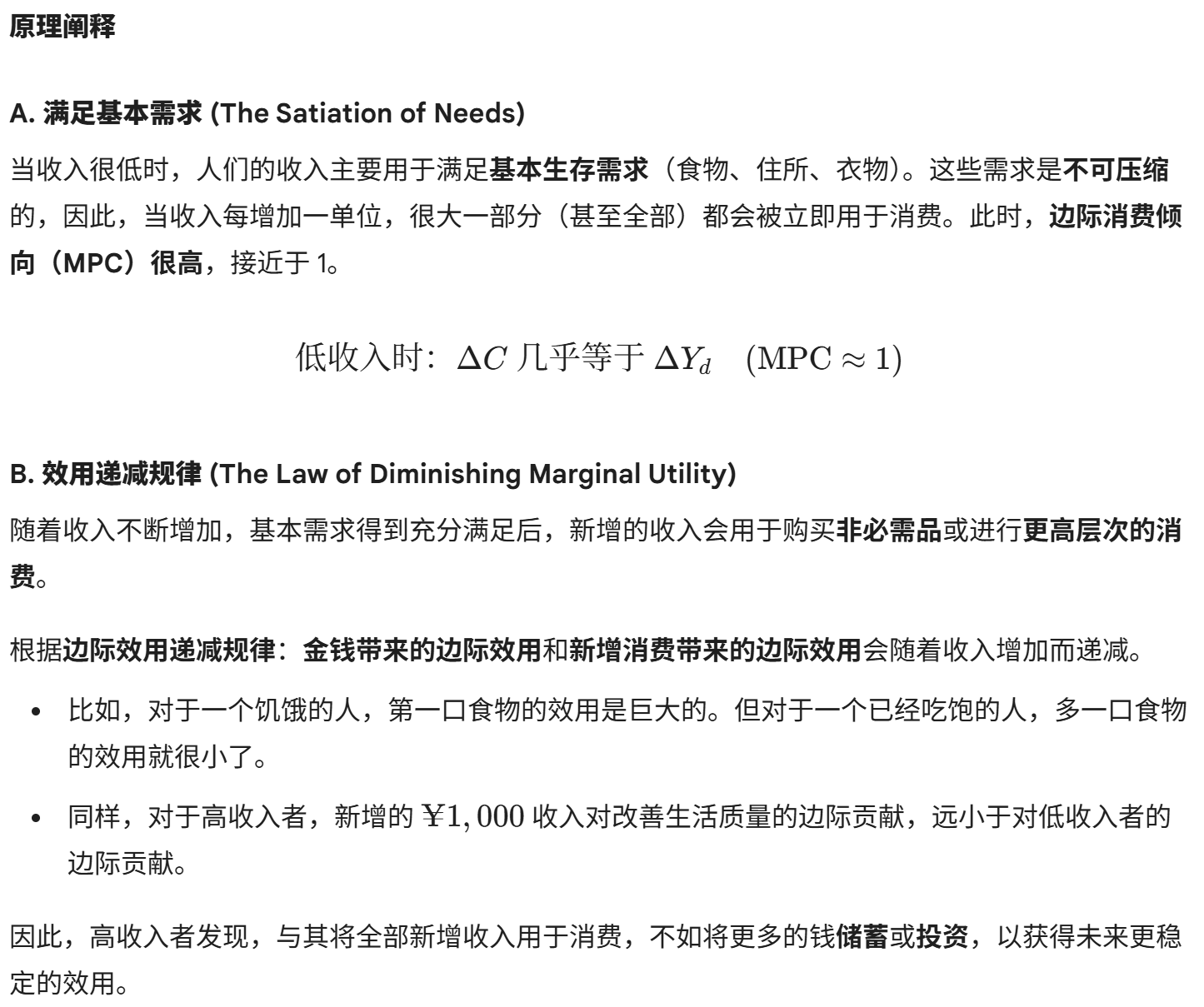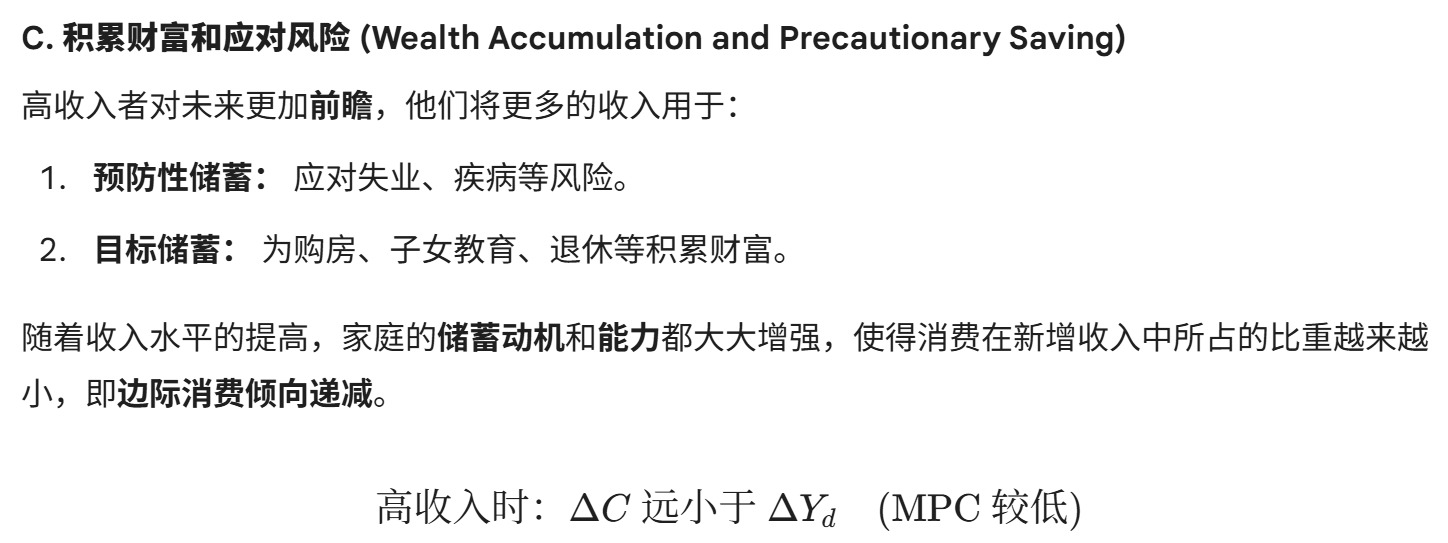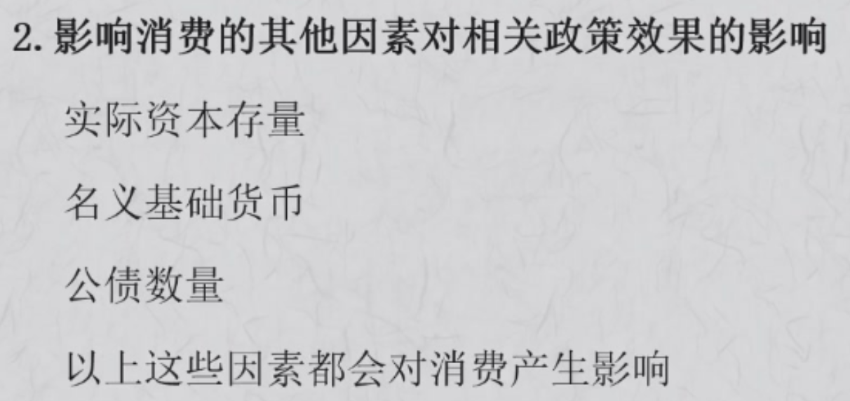 - 短期来看,边际消费倾向高比较好,生产出来的东西都能卖出去,促进经济增长。但是长期来看,当边际消费倾向过高时,储蓄不足,下一轮扩大再生产,没钱了。可以借钱,发国债,美国国债特别高,但是只有美国能这样,因为国家信誉高。近年来中国逐渐抛售美国国债,转而买黄金