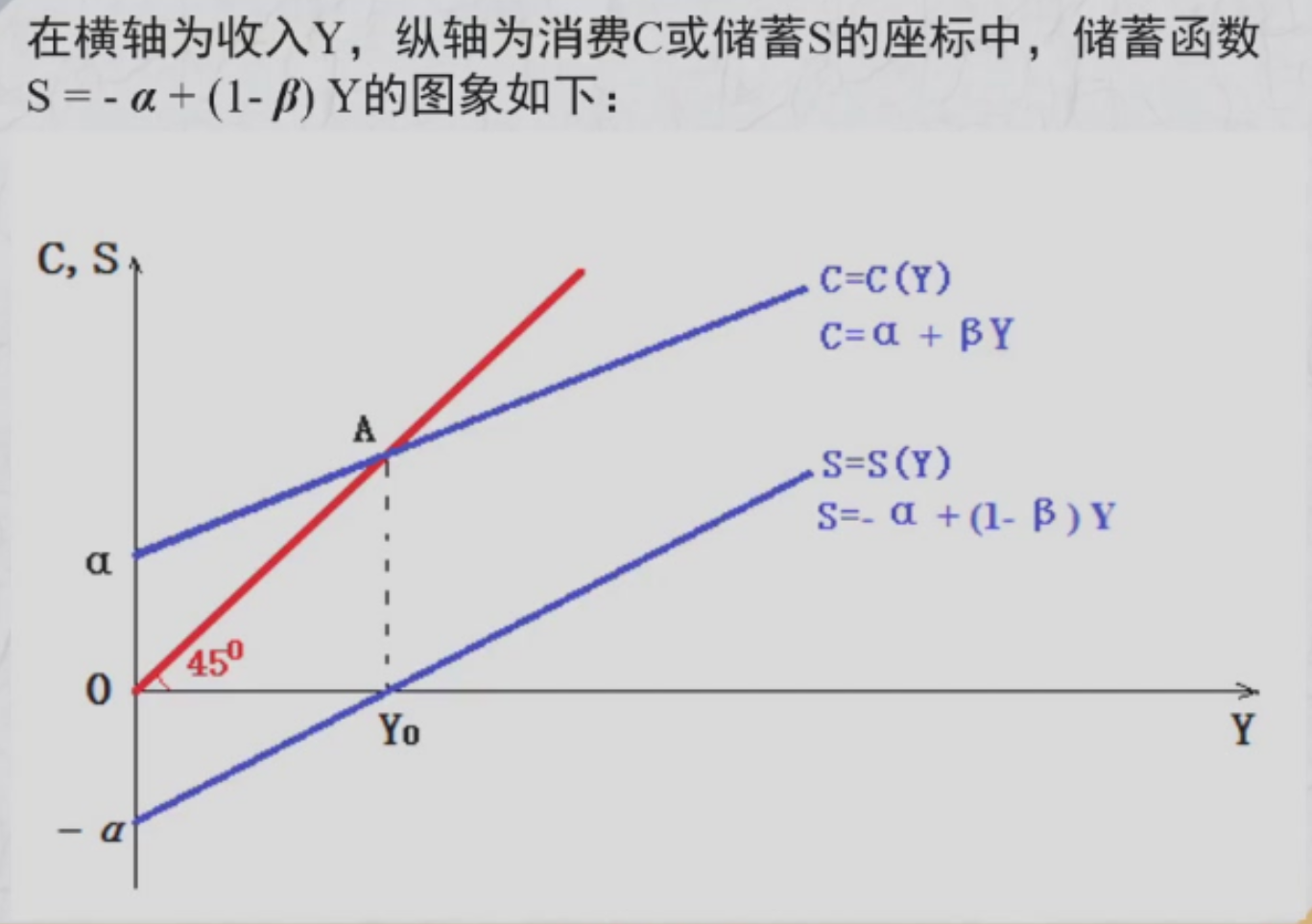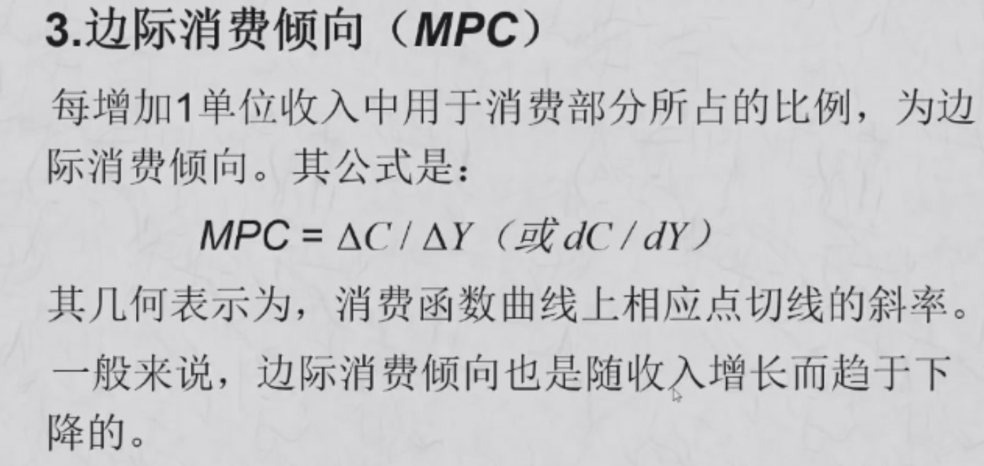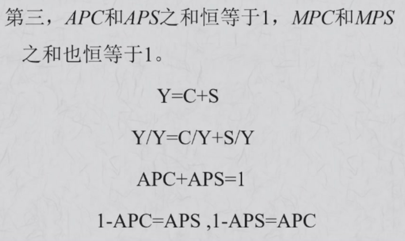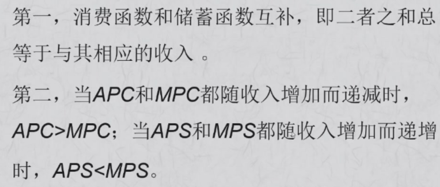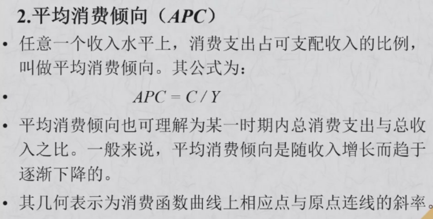 - 平均消费倾向 > 边际消费倾向,随着收入增加,平均消费倾接近边际消费倾向