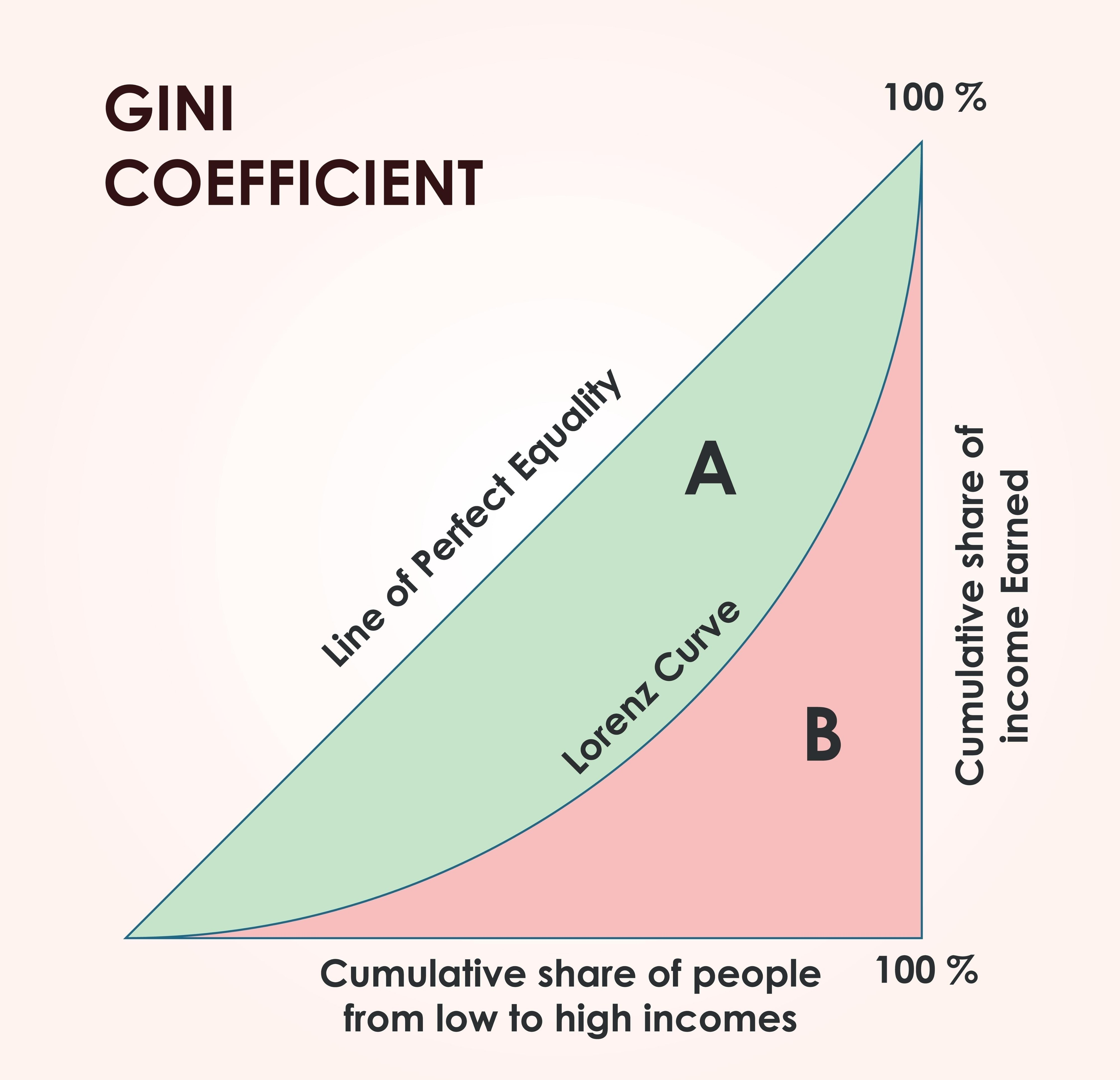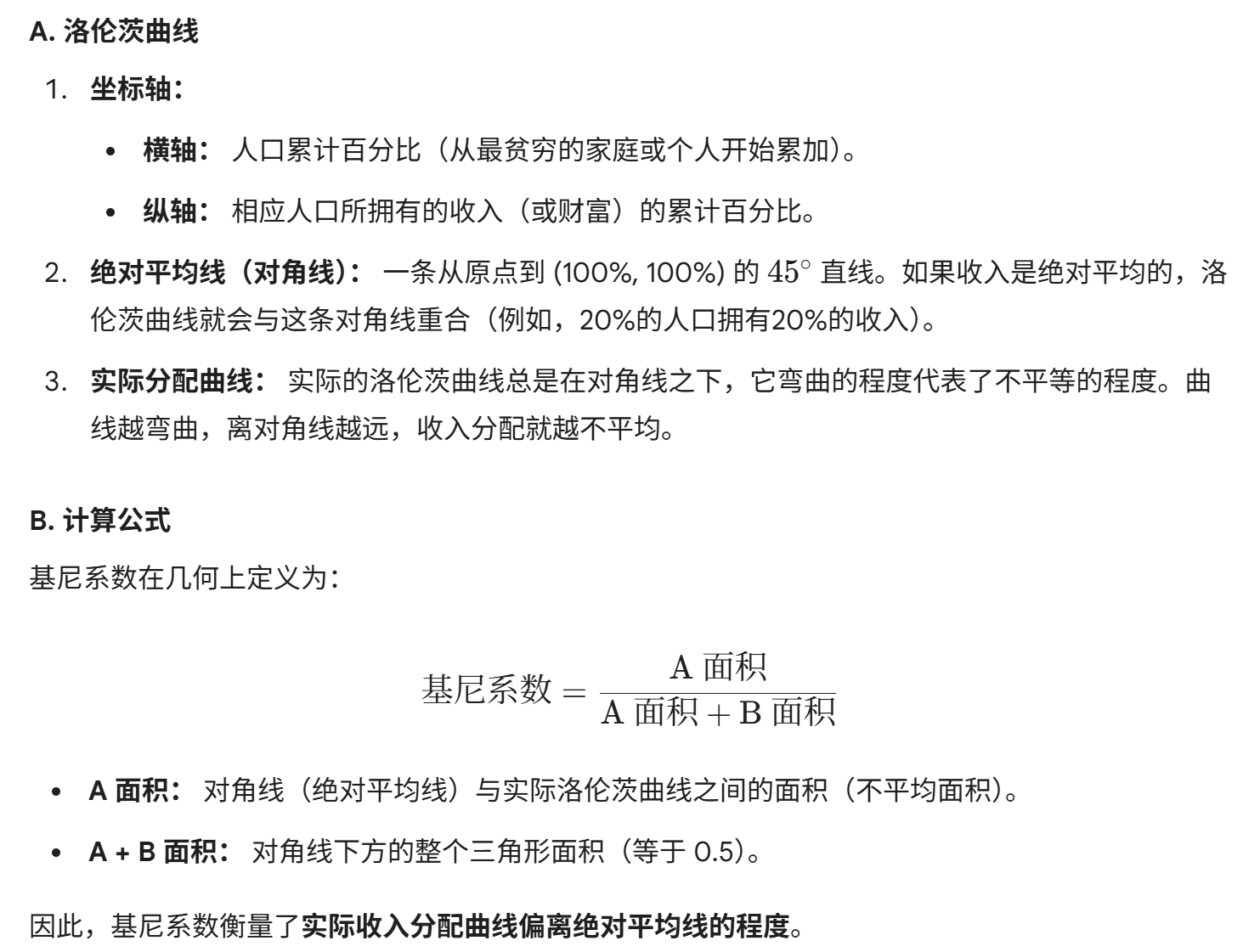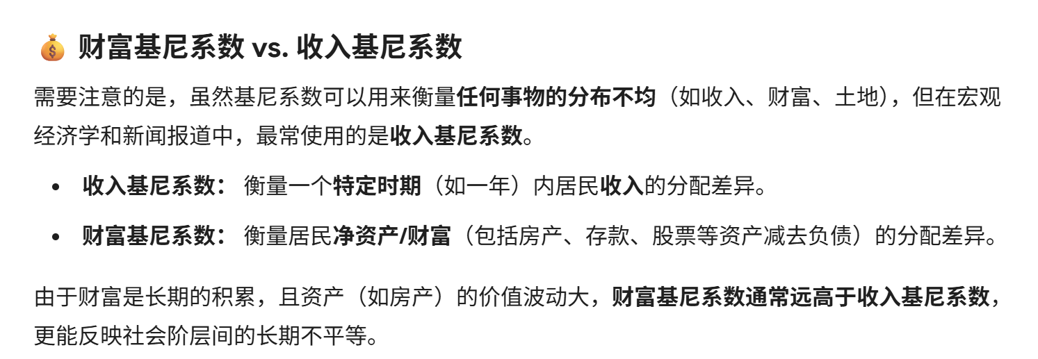 - 财富分配状况:指的是社会整体的财富分配,用基尼系数(Gini Coefficient)来衡量