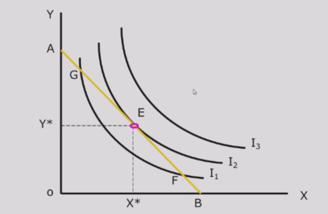 理解:首先肯定得在消费预算线上面,另外保证效用最大,即无差异曲线尽可能往右上方