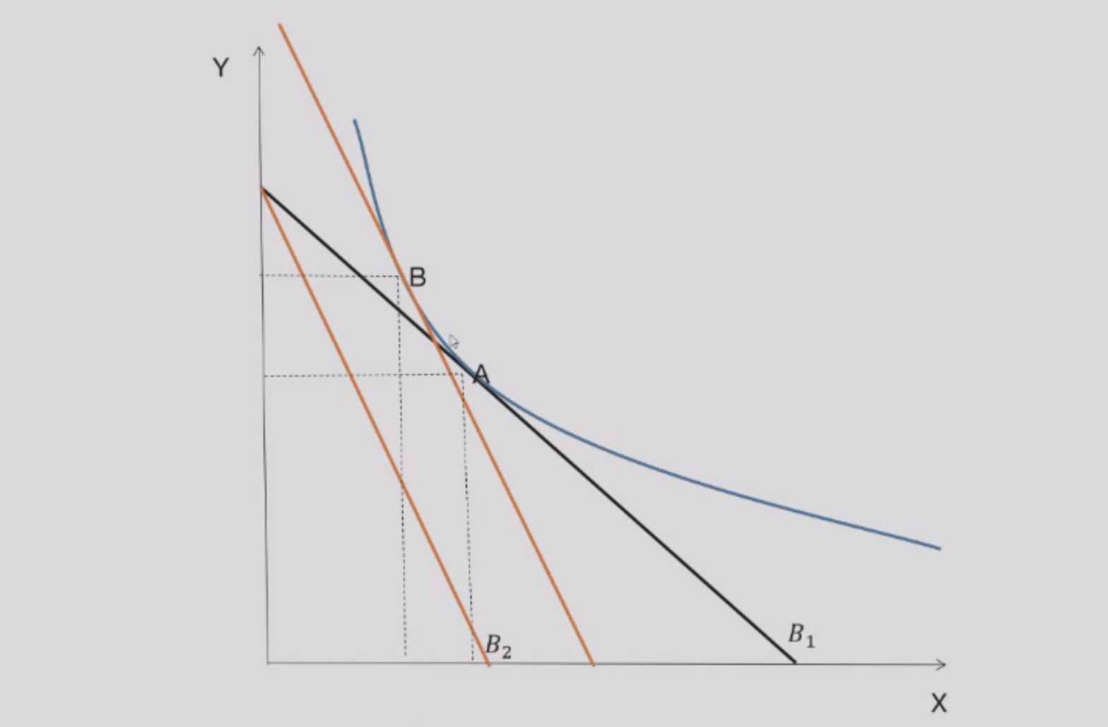 平移:从 \(B_1'\) 到 \(B_1\),实际收入变化引起的收入效应(即平移导致的 X 的变化就是收入效应)