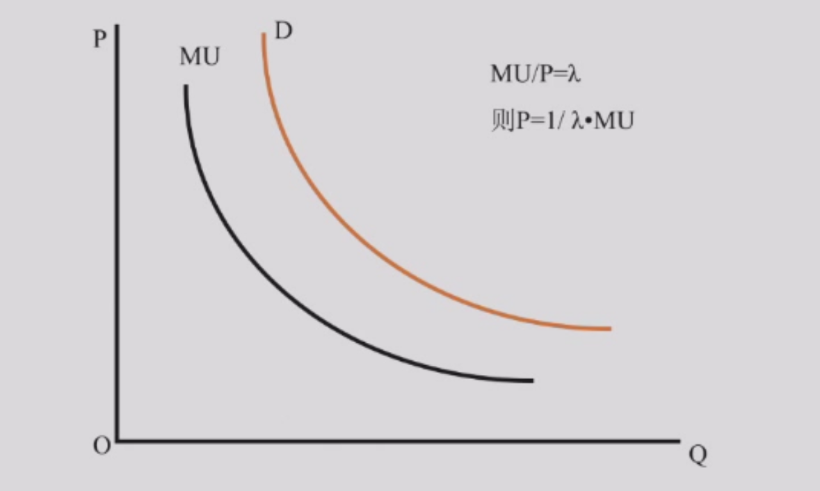 \(P = \frac{\lambda}{MU}\), MU 递减,需求曲线也就递减,因为消费者从商品那里获得了边际效用,才会有需求