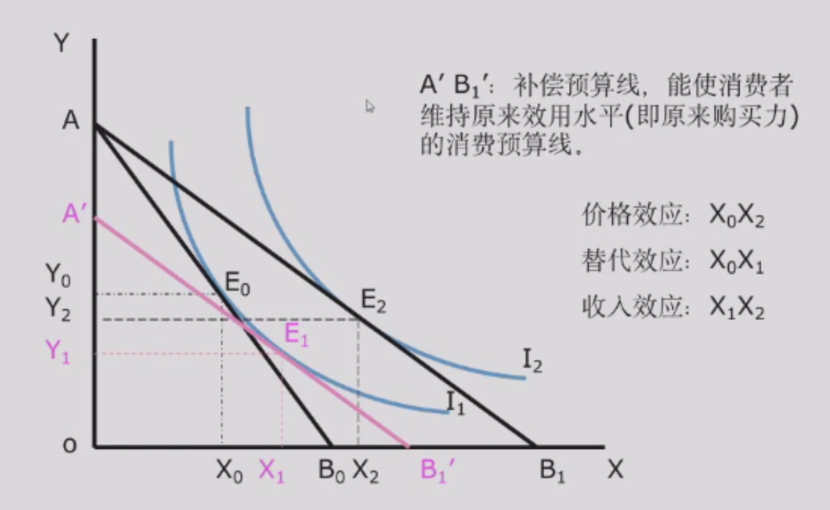 转动:从 \(B_0\) 到 \(B_1'\),保持实际收入不变,价格变化引起的替代效应(即旋转导致的 X 的变化就是替代效应)