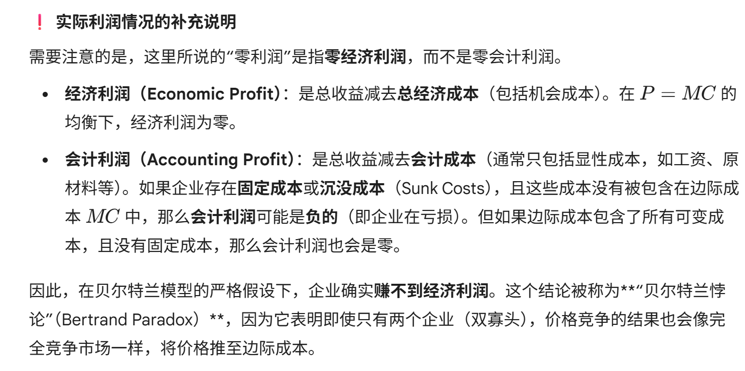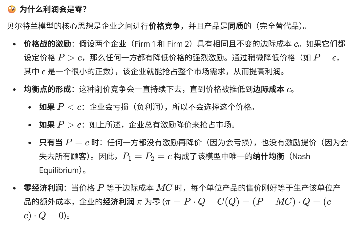 均衡价格 = 边际成本,仅存在唯一的纳什均衡(唯一价格)