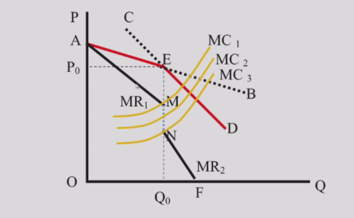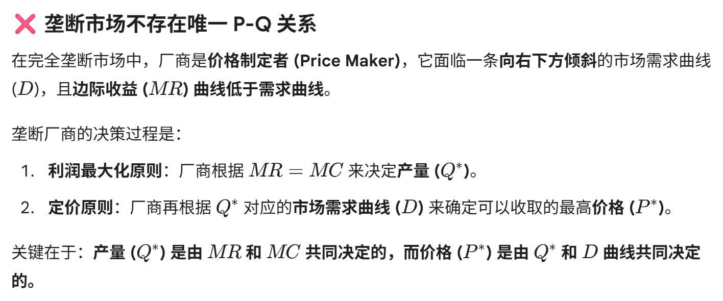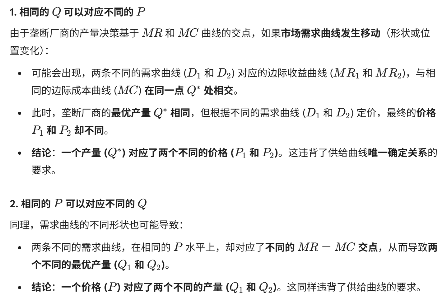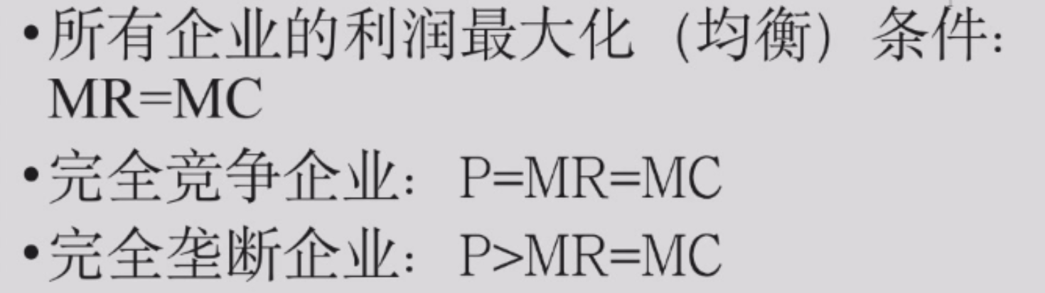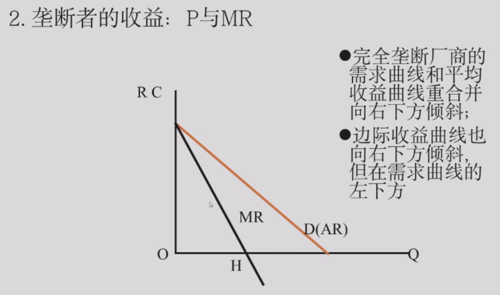 - MR 曲线同样在需求曲线下方。因为只要 P 和 Q 成反方向变化,MR 就小于 P