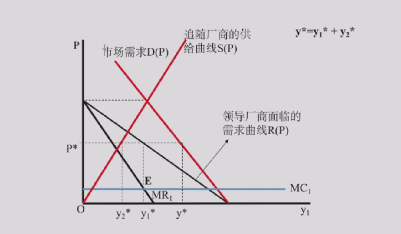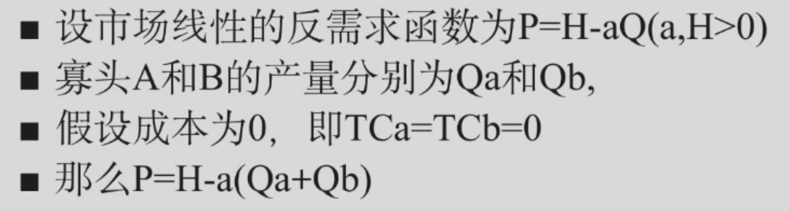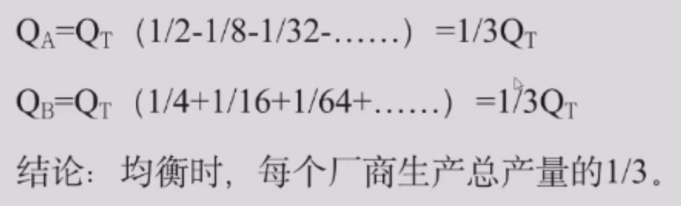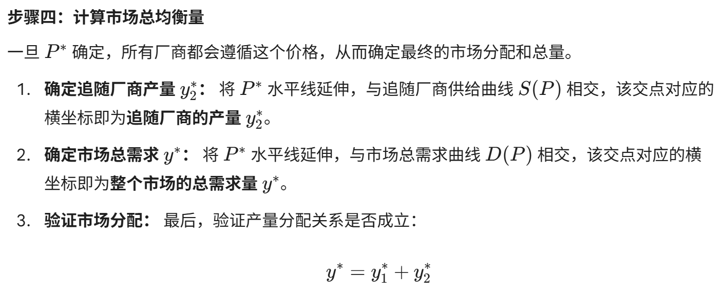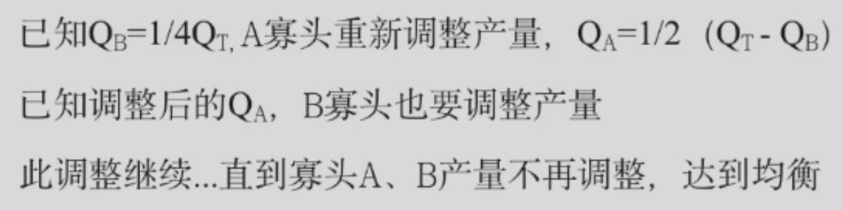- 这里可以联立的原因:A的反应函数里面 \(Q_B\) 是 A 认为 B 的产量,当 B 实际的产量等于 A 认为的产量时,就不再发生变化。 5. 将均衡产量代入总需求函数,解出均衡价格 \(P^*\)。