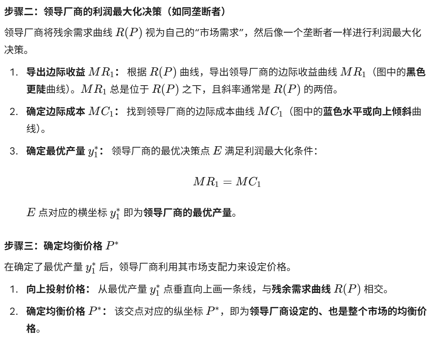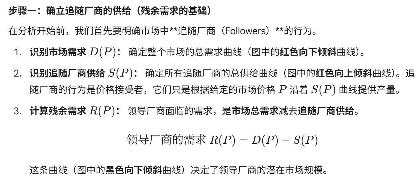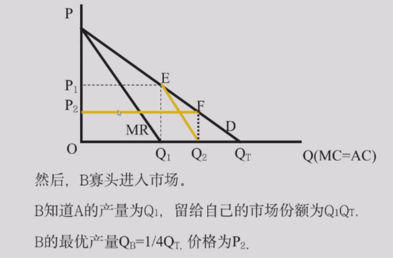 - 不能直接用 A 的收益函数对 \(Q_A\) 求导,因为 B 会根据 A 的产量来调整自己的产量,即 \(Q_B\) 是变量。 5. 对 A 求 \(\Pi_A\) 关于 \(Q_A\) 的一阶导数,令其等于 0,解出均衡产量 \(Q_A^*\)。 6. 将 \(Q_A^*\) 代入 B 的反应函数,解出均衡产量 \(Q_B^*\)。 7. 将均衡产量代入总需求函数,解出均衡价格 \(P^*\)。