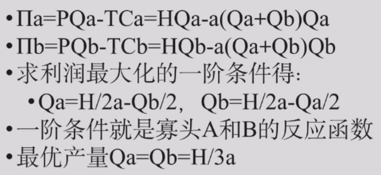 - 反应函数:做出 best response 的函数。即给定 H 和 \(Q_B\),A 根据这个函数求出的最优产量是多少。