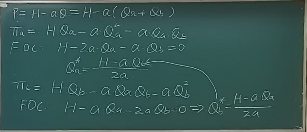 - 对 B 求 \(\Pi_B\) 关于 \(Q_B\) 的一阶导数,令其等于 0,解出 B 的反应函数 \(Q_B^* = \frac{H - aQ_A}{2a}\)。