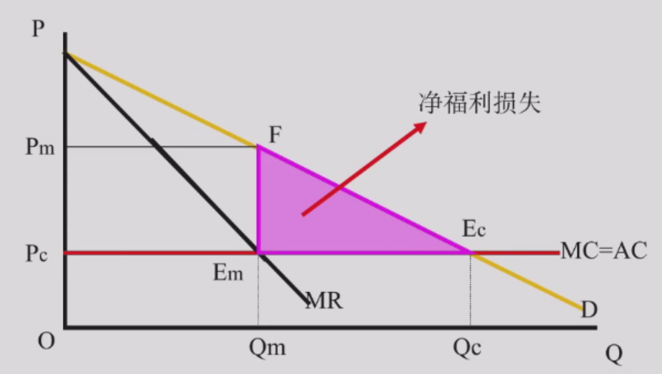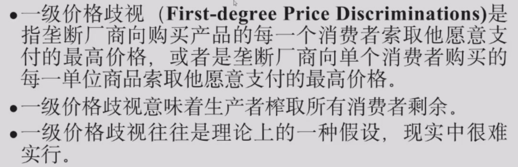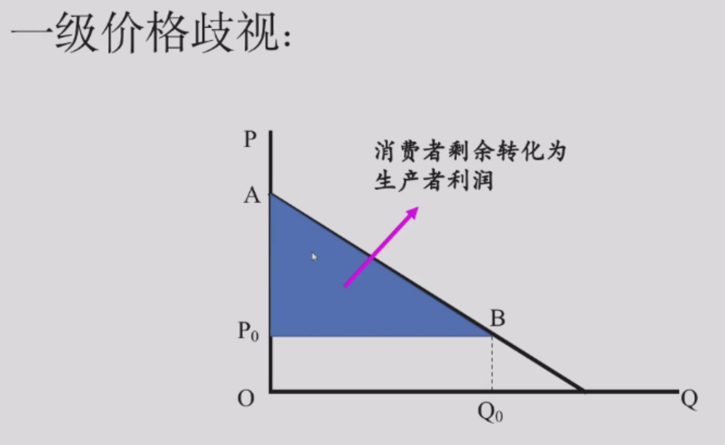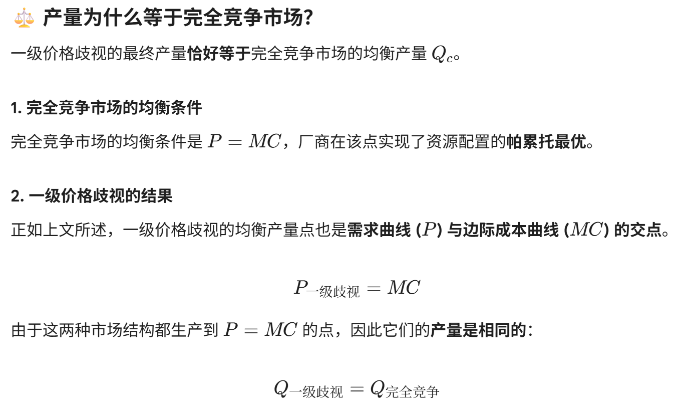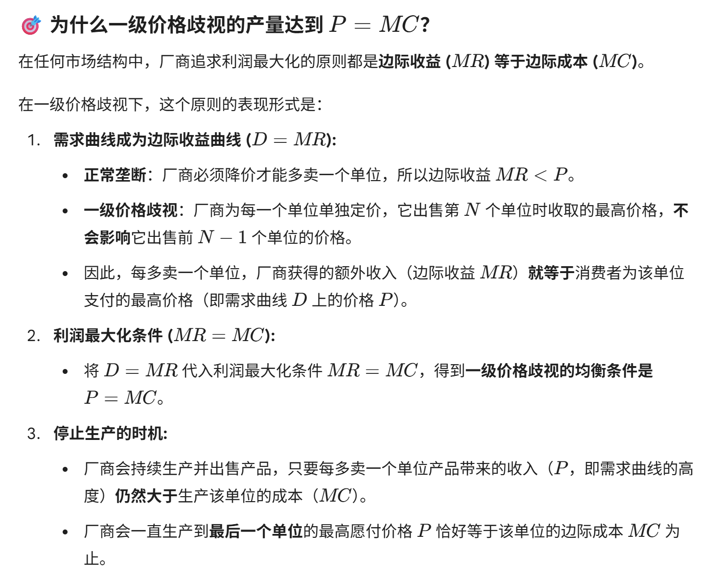 一级价格歧视卖到P = MC为止,产量等于完全竞争市场的时候