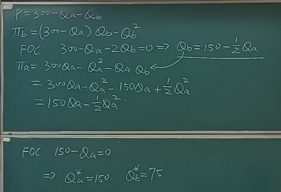 列出先发者的收益函数 \(\Pi_A = P * Q_A = (H - a(Q_A + Q_B^*))Q_A\),将 B 的反应函数代入。