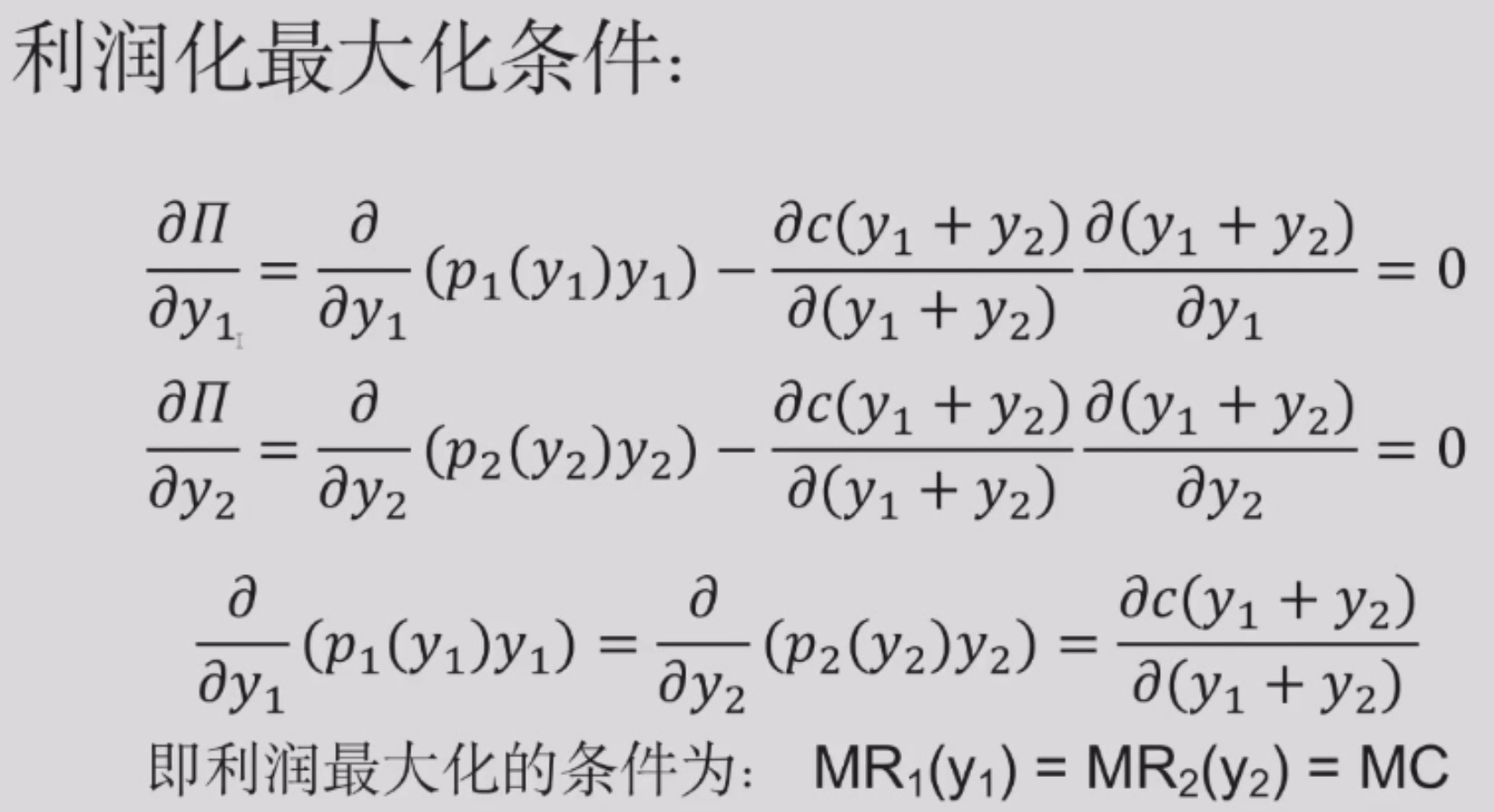 - 如果 MR1 > MR2,则可以通过增加市场 1 的产量并减少市场 2 的产量来增加总利润,反之亦然。因此,利润最大化的条件是 MR1 = MR2。