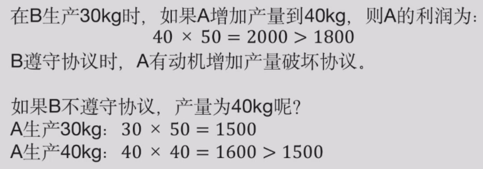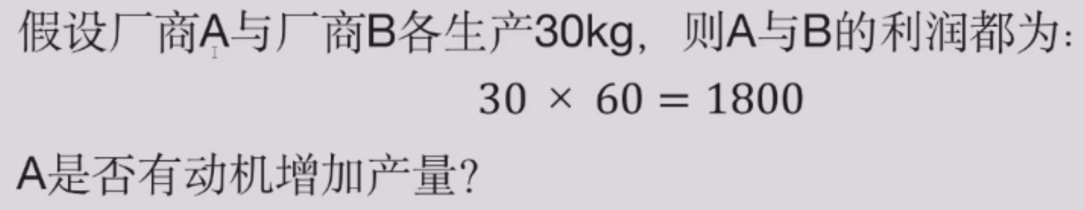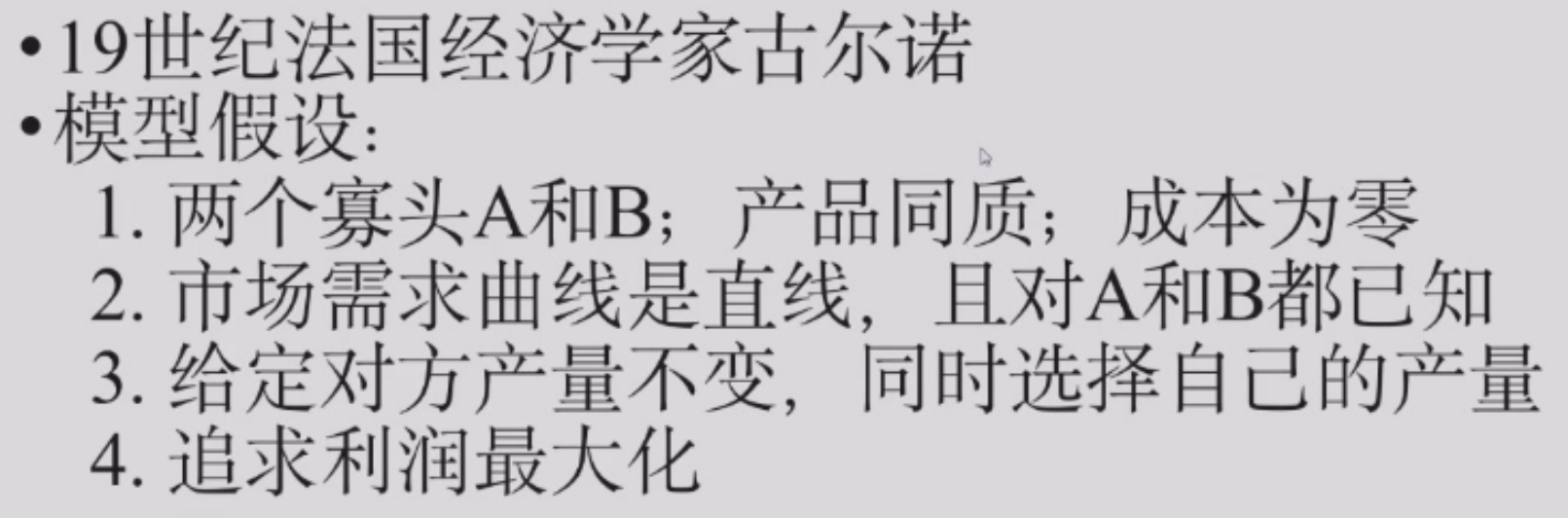 A 和 B 同时做决定,A 在做决策时觉得 B 的产量不变。不能观测到对方的决策。A 在做决策时推测 B 的产量是多少,按照这个产量来决定自己利润最大的产量。
