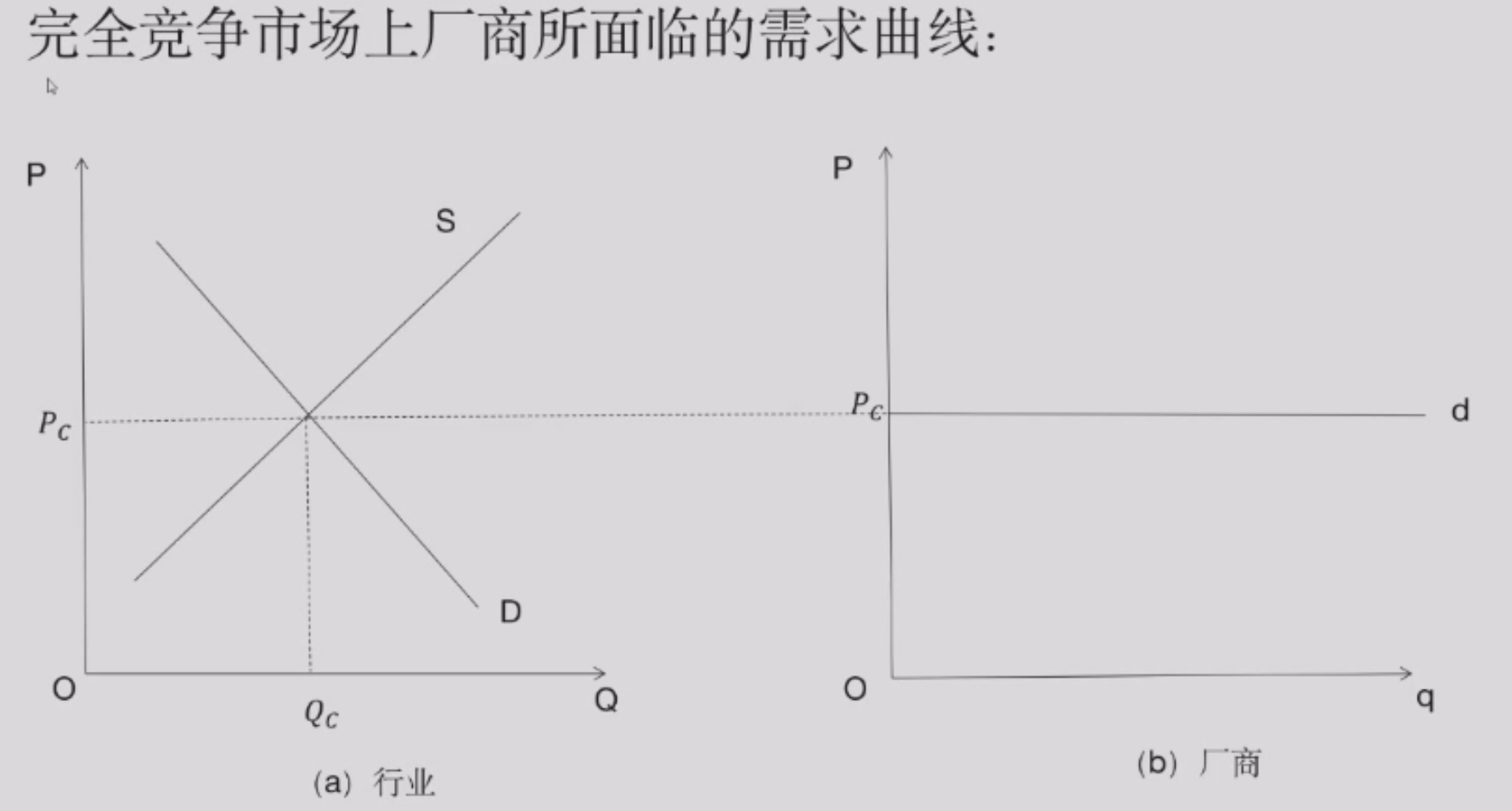 由于厂商是价格接受者,所以需求曲线是水平的,对应的价格是市场价格均衡时候的 \(P\)。