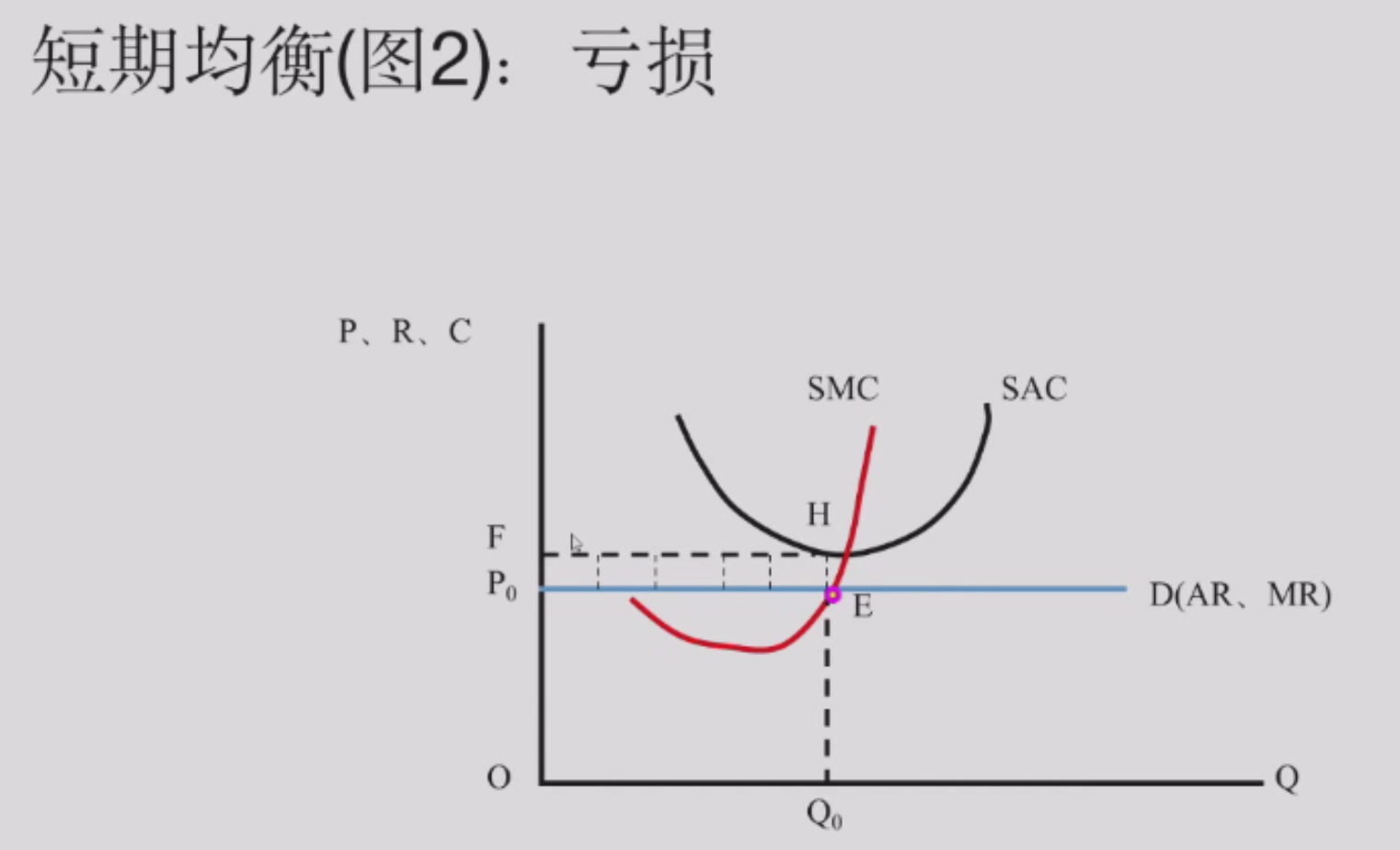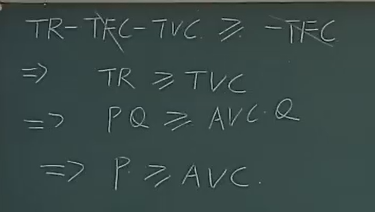 这时候 \(P < AC\), 在亏损,也就是 E 点亏的最少(负利润)