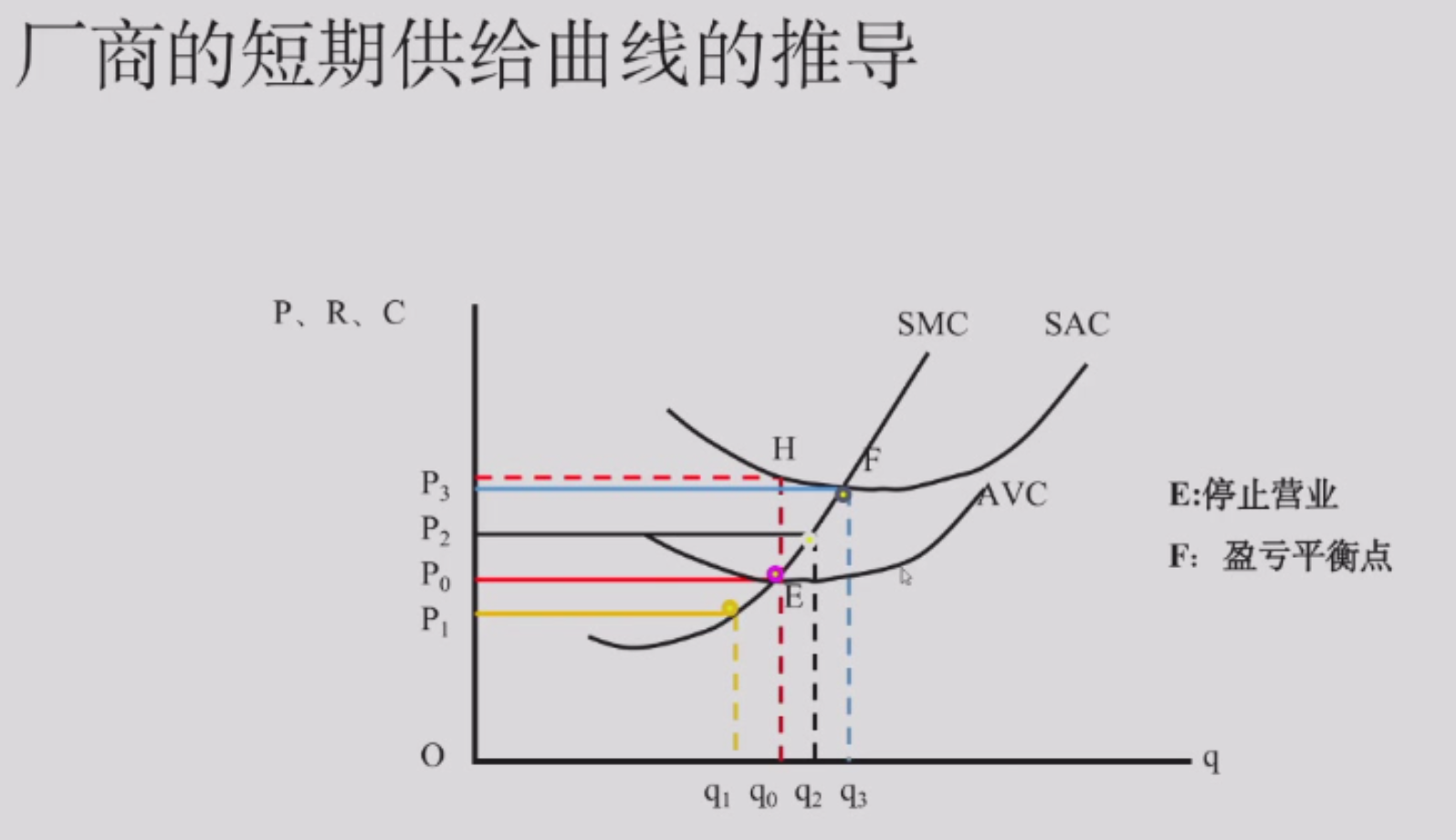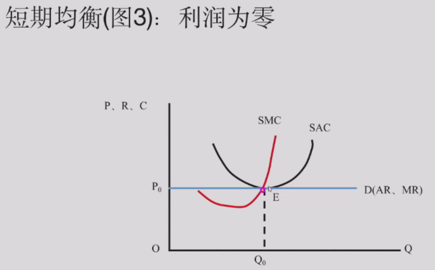 当 \(P = MC\) 时利润最大,即短期均衡的话,\(P = SMC\),即 E 点,对应 \(Q_0\) 数量