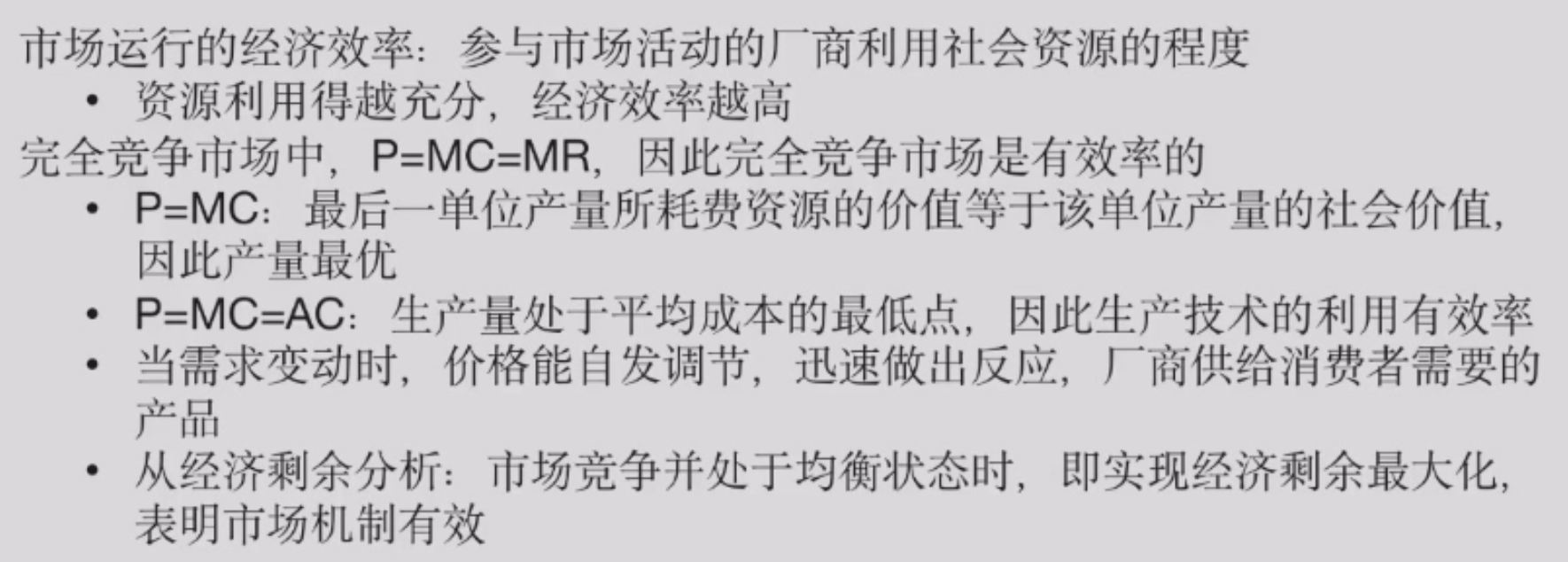 P = MC:社会价值 = 生产消耗的资源,资源配置效率。当 P > MC 时,社会价值 > 生产消耗的资源,应该多生产,当 P < MC 时,社会价值 < 生产消耗的资源,应该少生产。