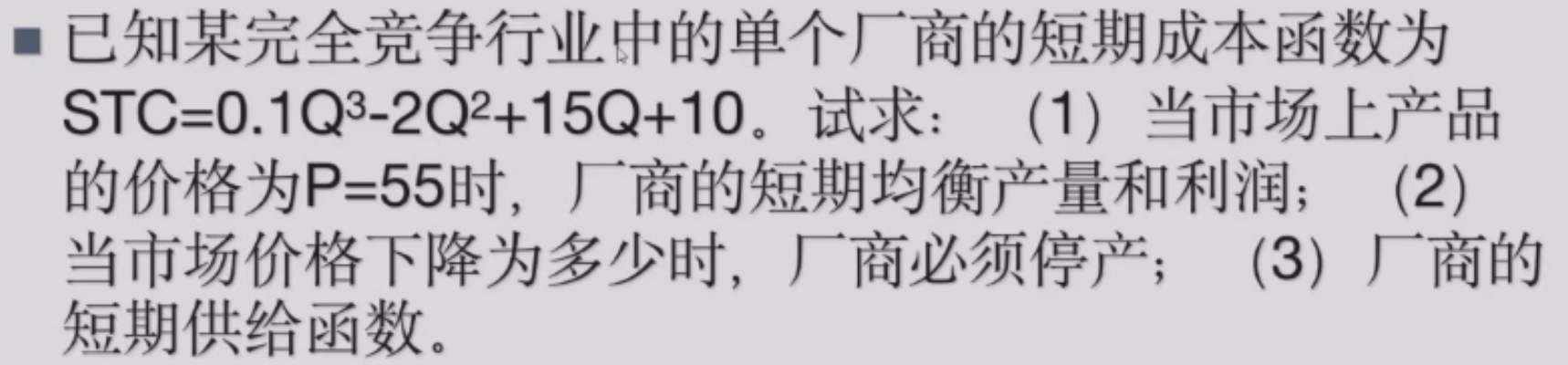 - 是 SMC 的原因:因为 \(P = SMC\) 时利润最大,所以给定 P,厂商作为价格接受者,会使得 P = SMC,会选择 SMC 曲线上对应的 Q 作为供给量