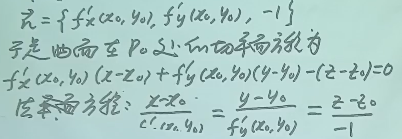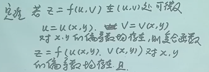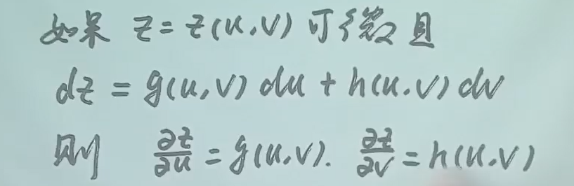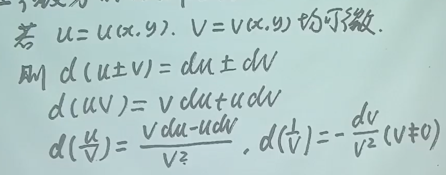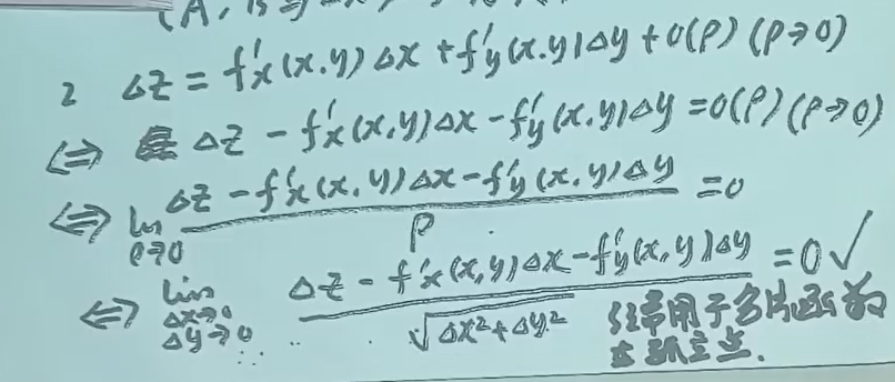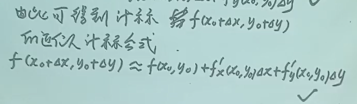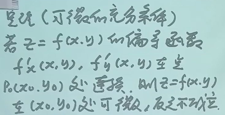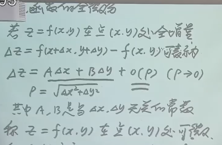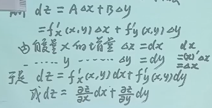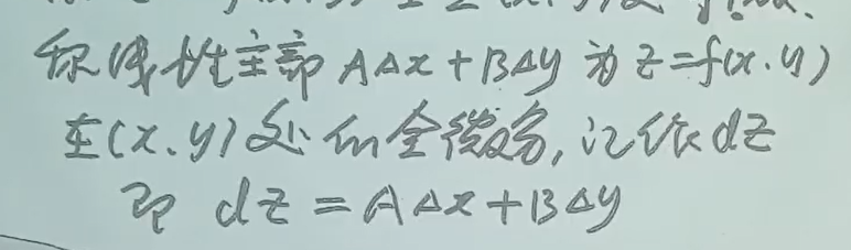 设 \( z = f(x, y) \) 在点 \( (x_0, y_0) \) 处可微,则全微分公式为: [ dz = \frac{\partial f}{\partial x} \bigg|{(x_0, y_0)} dx + \frac{\partial f}{\partial y} \bigg| dy ]