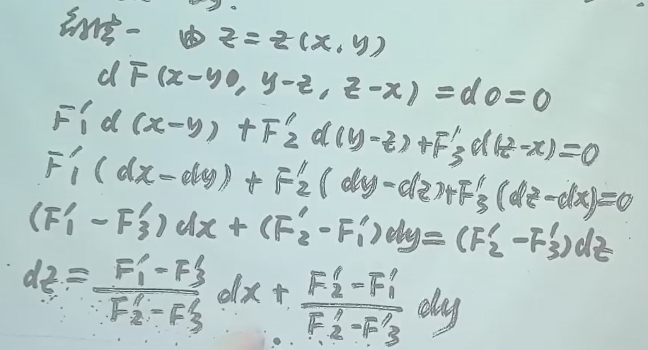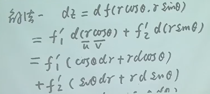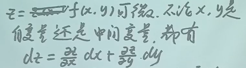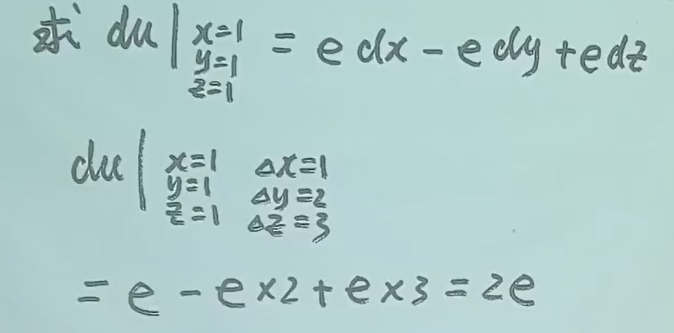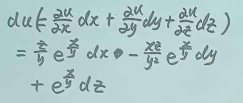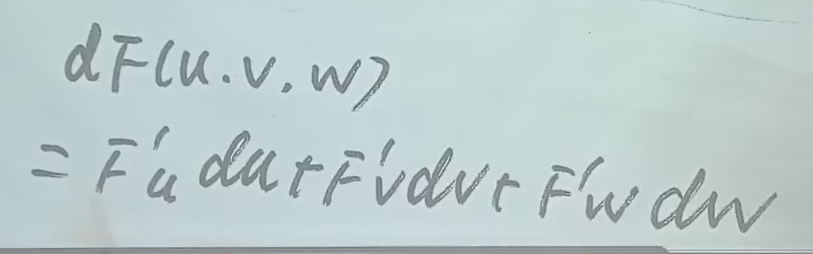 \[ du = \sum_{i=1}^n \frac{\partial f}{\partial x_i} dx_i = \frac{\partial f}{\partial x_1} dx_1 + \frac{\partial f}{\partial x_2} dx_2 + \cdots + \frac{\partial f}{\partial x_n} dx_n \]其中: - \( \frac{\partial f}{\partial x_i} \) 是函数对第 \( i \) 个变量的偏导数, - \( dx_i \) 是自变量 \( x_i \) 的微小增量。