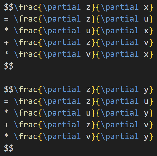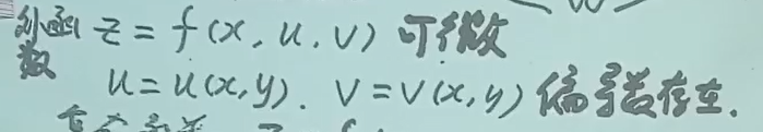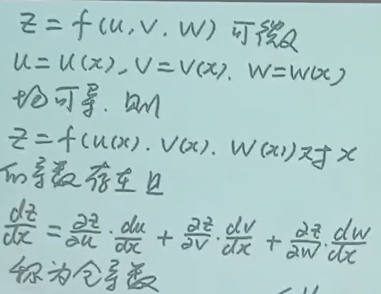 因变量对中间变量分别偏导, 中间变量对x偏导, 相乘再相加。一元函数全是求导,多元函数全是偏导