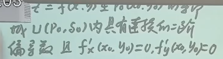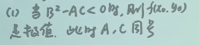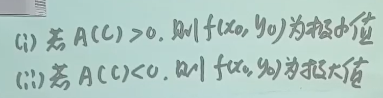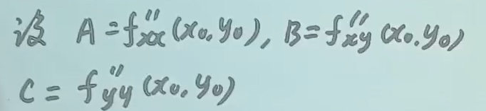 - 对于驻点:求三个二阶偏导数,看他们的关系,即用如下充分条件