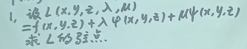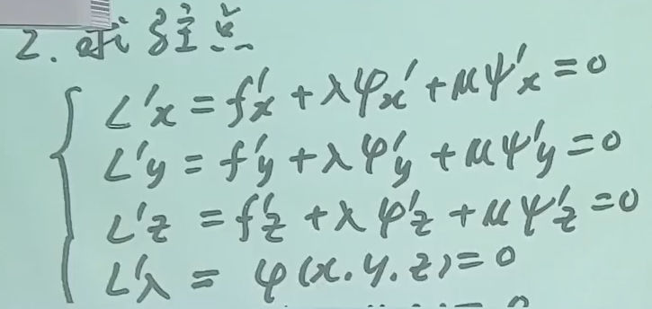 \[ \begin{cases} \frac{\partial \mathcal{L}}{\partial x} = \frac{\partial f}{\partial x} + \lambda \frac{\partial g}{\partial x} = 0 \\ \frac{\partial \mathcal{L}}{\partial y} = \frac{\partial f}{\partial y} + \lambda \frac{\partial g}{\partial y} = 0 \\ \frac{\partial \mathcal{L}}{\partial \lambda} = g(x, y) = 0 \end{cases} \]解得 \( (x, y, \lambda) \),其中 \( (x, y) \) 即为极值怀疑点,如果算最大最小值:再进一步算函数值得到最大值 / 最小值。
