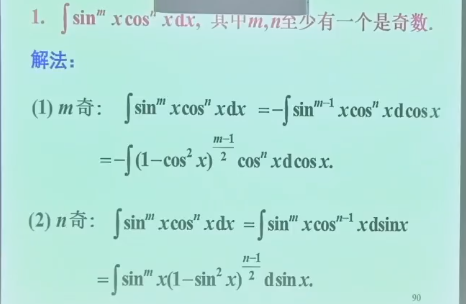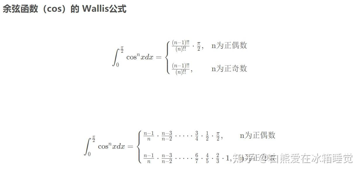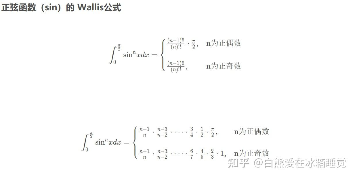- 重要公式: $$ \int_0{\fracπ2}\sinx = \int_0}x\, {\rm d{\fracπ2}\cosx = \left{ \begin{aligned} &\frac{n - 1}{n} \frac{n - 3}{n - 2} \cdots \frac23 1 ,n为奇数\ &\frac{n - 1}{n} \frac{n - 3}{n - 2} \cdots \frac12 \fracπ2 ,n为偶数\ \end{aligned} \right. $$ }x\, {\rm d\(\(\int_0^{2π} = 2\int_0^{π} = 4\int_0^{\fracπ2}\)\)